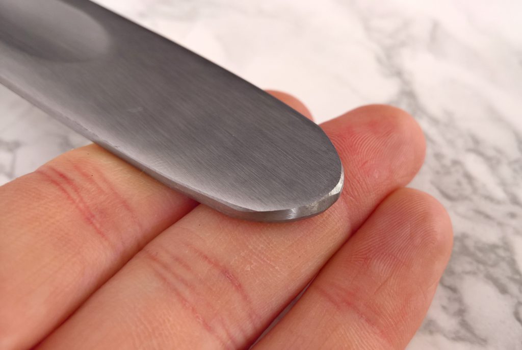 The blunt thick-edged practice weapons have an edge thickness around 2 – 2,5 mm, and they are not designed to be sharpened.
