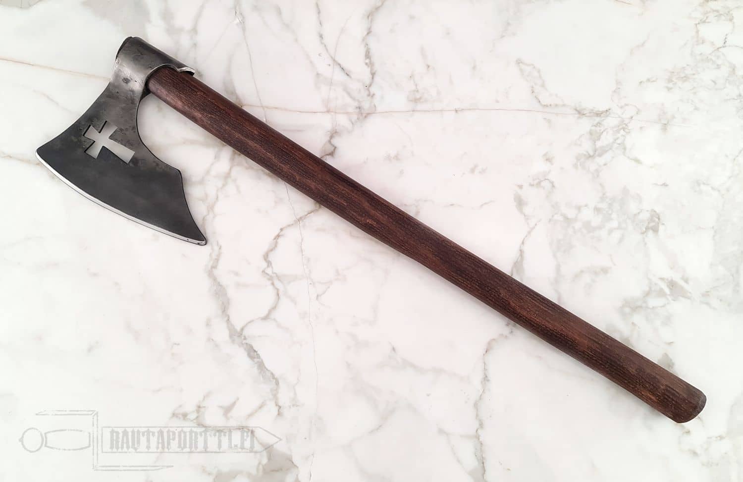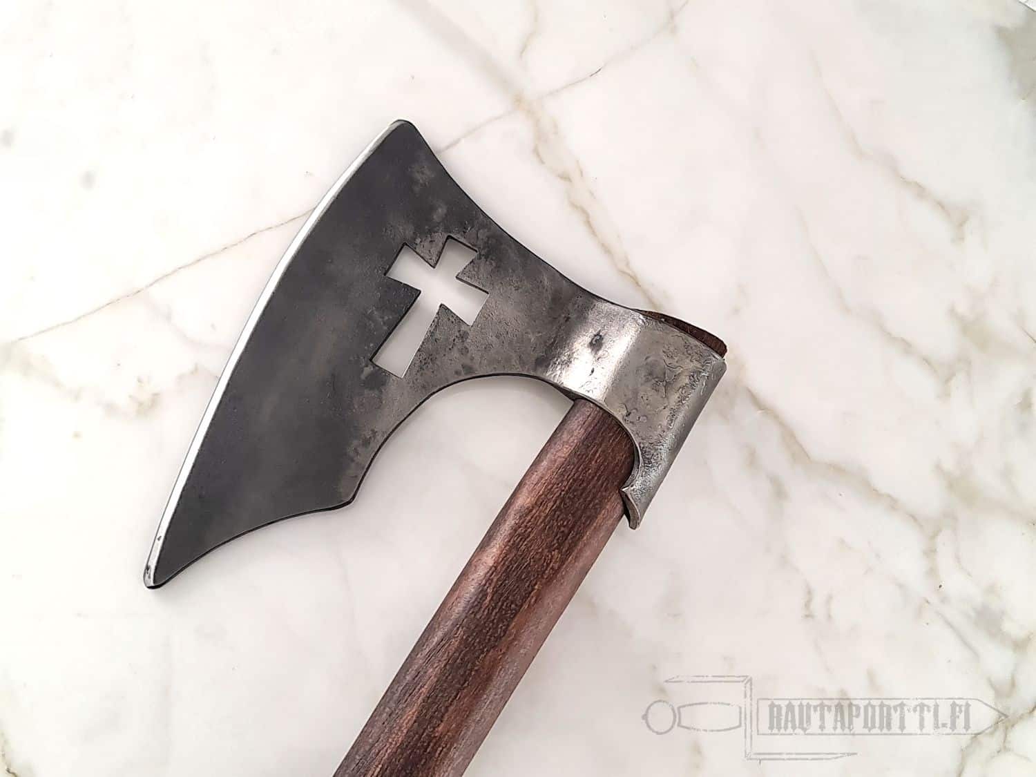 Tämän kirveen terään on leikattu ristin mallinen aukko.Vaikka ristiretkiaika 1300-luvulla jo olikin historiaa, oli kristillisyyden korostaminen iso osa ritarillisia hyveitä. 1300-luvulla ritarillisuuteen kuuluikin juuri ristiretkiajan urhoollisten sankaraiden ja uskonpuolustajien ihannointi ja imitointi. Kristilliset symbolit, kuten risti, olivat tärkeitä ulkoisia merkkejä joilla näitä ritarillisia hyveitä saattoi ilmentää ulospäin. Niinpä ristikirves toistaa aiempien vuosisatojen ristiretkeläiskirveen ristiteemaa, eräänlaisena fanituksen muotona, mutta tietysti myös kantajansa oman uskon merkkinä ja vahvistajana.