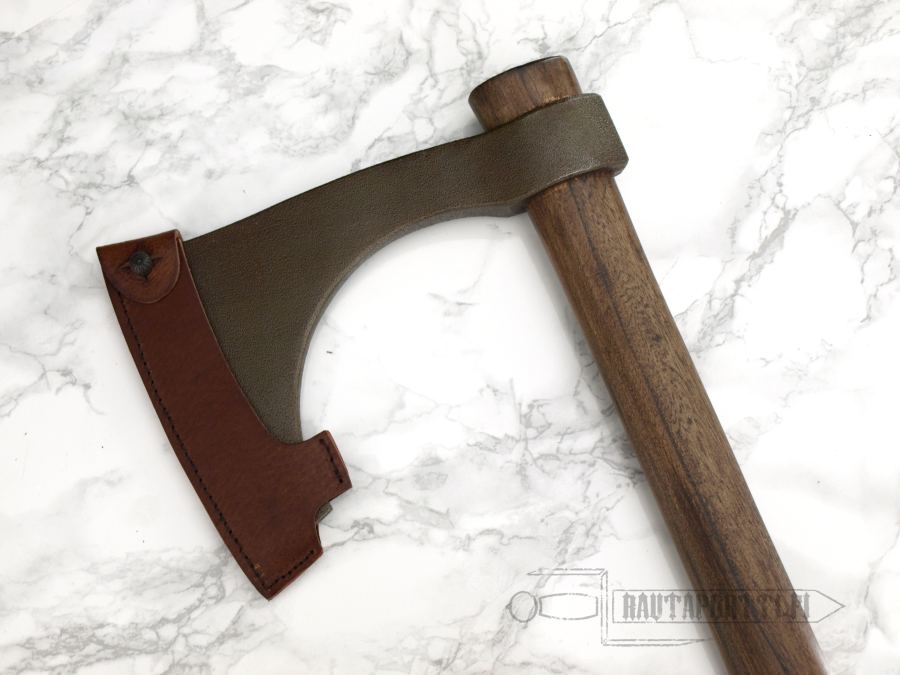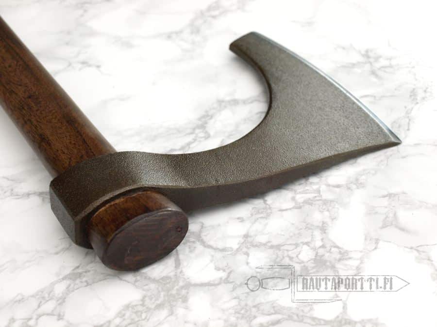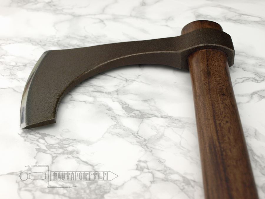 Tässä keskiraskaassa kirveessä on hiiliteräksestä taottu, karkaistu terävä terä ja kovapuinen varsi. Terä on paksuudeltaan keskikastia ja soveltuu niin taistelukirveeksi kuin puuntyöstöönkin ja pienten polttopuiden halkaisuun. Terän pinta on antikoitu/patinoitu autenttista ulkomuotoa varten. Tämä kirves on tehty käytettäväksi, ja se kädessäsi voit tuntea itsesi menneiden aikojen viikinkiretkeilijäksi jo halkoja tehdessäsi. Kirveen mukana toimitetaan nahkainen teräsuoja.