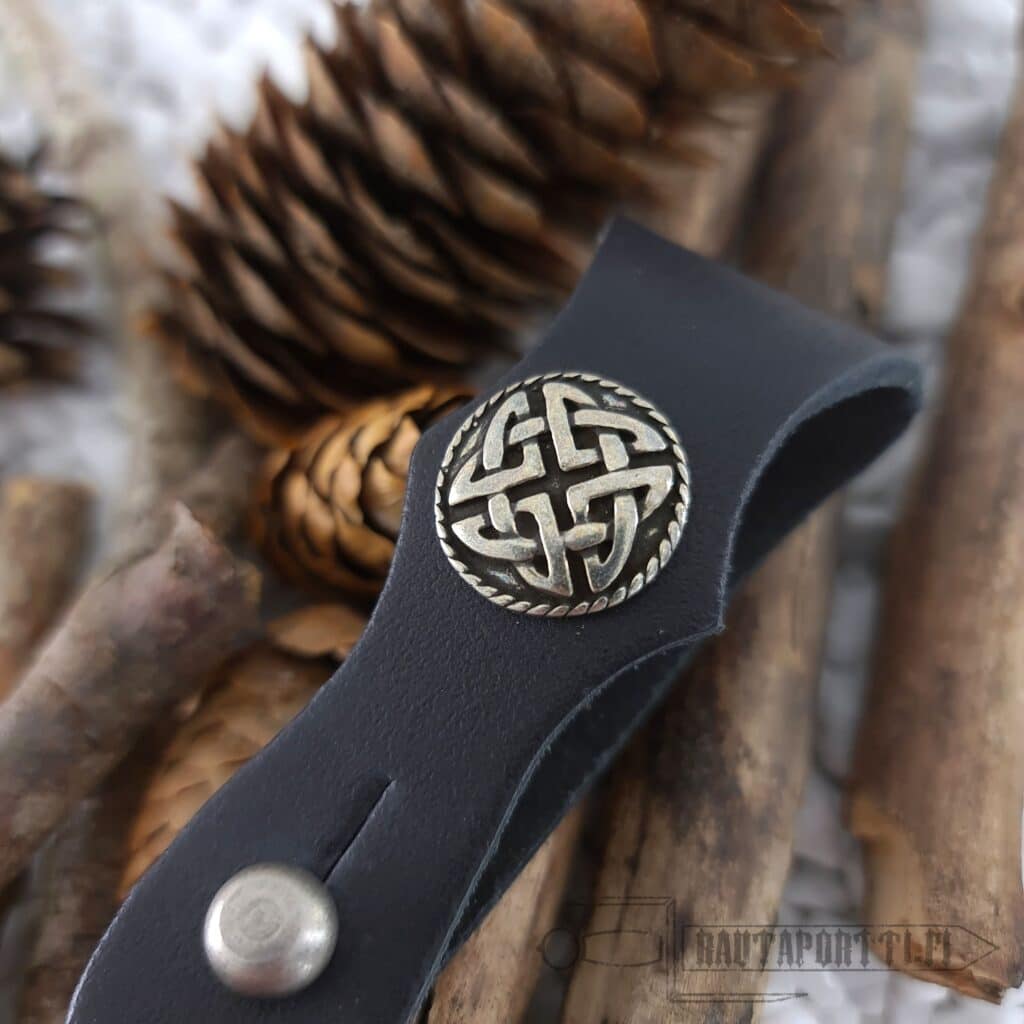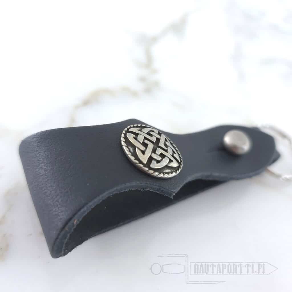 Tämä avaimenperä on valmistettu nahasta, ja siinä on samakista valmistettu koristeniitti sekä sulkumekanismi. Avaimenperä sopii täydellisesti niin historian elävöittämiseen, larppaamiseen kuin myös arkikäyttöön.