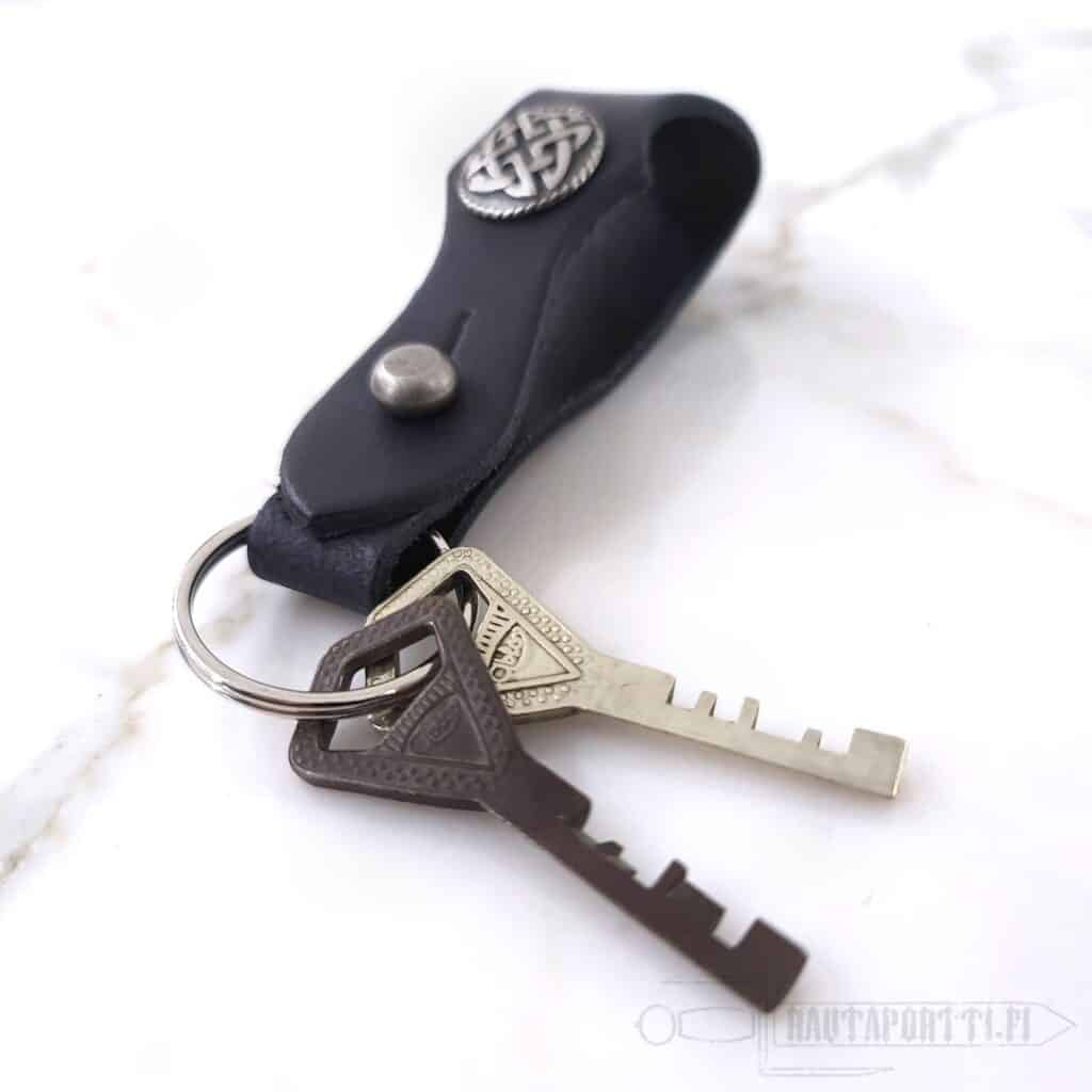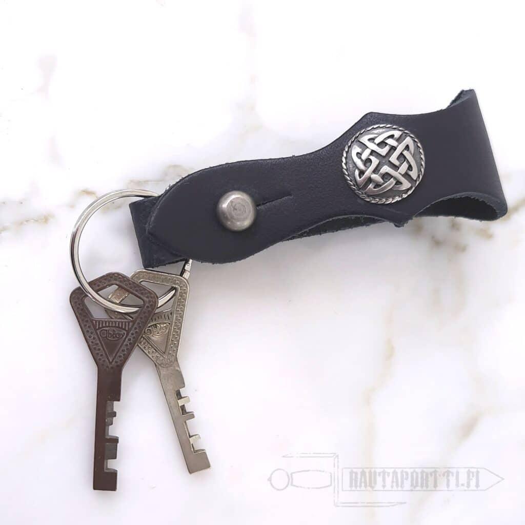 Keskiaikatapahtuma käynnissä ja auton avaimet jossain laukun pohjalla? Larppi alkamassa etkä tiedä, minne kotiavaimet oikein laittaisi? Arkiaamuna paniikinomainen avainten metsästys? Ei enää! Tällä avaimenperällä saat avaimesi kätevästi kiinnitettyä vyölle tai mihin tahansa lenkkiin, mistä ne on helppo ottaa käyttöön nopeasti aina tarvittaessa.