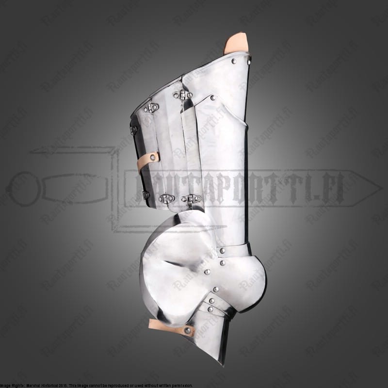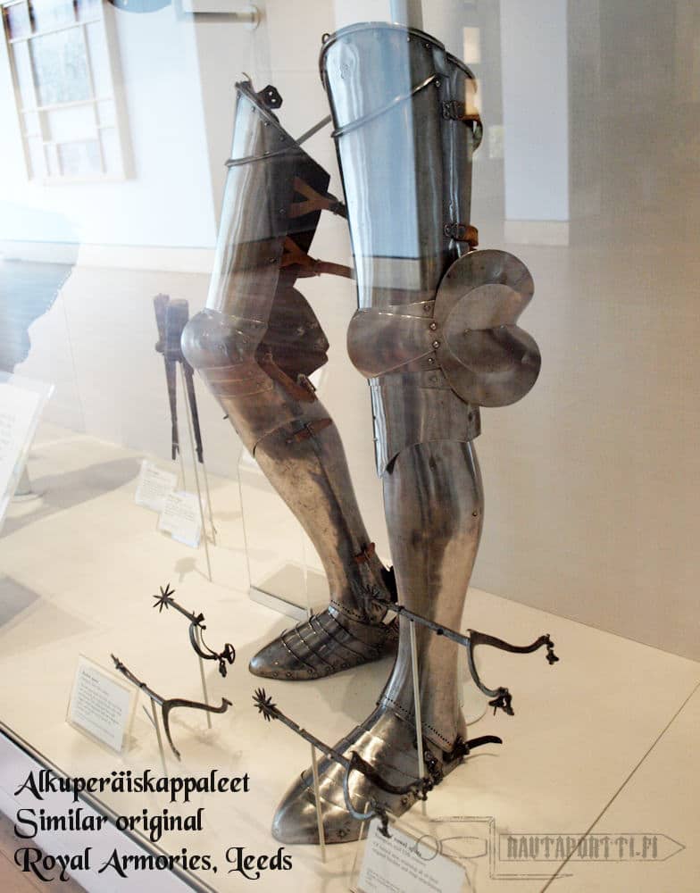Avant-haarniskan jalkapanssariin kuuluu reisiosa cuisse, polvikuppi poleyn, ja säärisuojan yläosa demi-greave. Tyypilliseen italialaiseen tapaan reiden sisäosaa ei ole suojattu levyllä. Italialaisten taistelutaktiikka nojasi enemmän raskaan ratsuväen käyttöön, jolloin sisäreisi jäi satulan suojaan. Haarniska kiristetään paikoilleen jalan takaa kolmella nahkasoljella, ja asetakkiin tai – vyöhön erillisillä kiinnitysnyöreillä. Polvien kolmoisnivellys tekee jalkapanssareista hyvin liikkuvat. Jalkapanssarin alaosassa on valmiina reikä, joka mahdollistaa erillisen umpinaisen säärisuojan kiinnityksen.