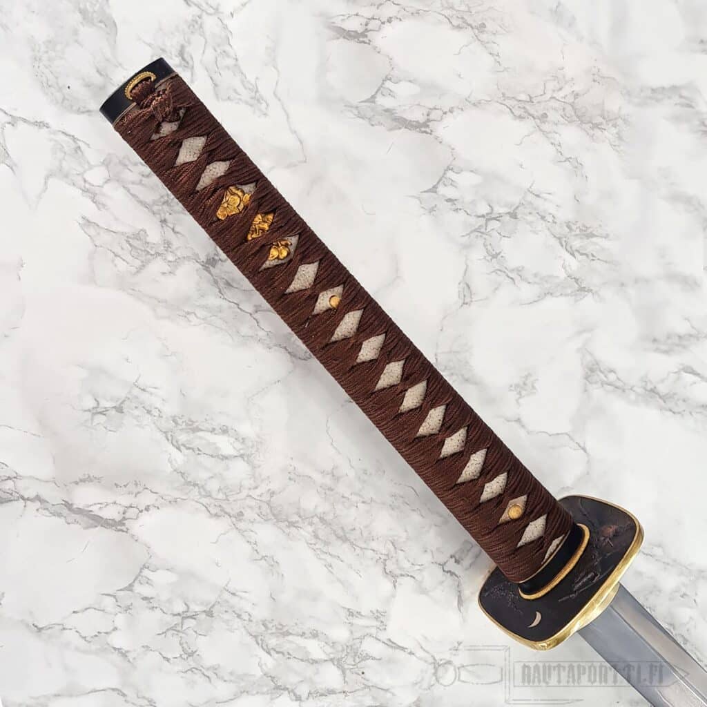 Tsuka-ito ja sageo on kudottu korkealaatuisesta japanilaisesta puuvillasta. Fuchi ja kashira ovat mustaksi patinoitua pronssia ja niiden reunukset/helat ovat messinkiä. Kojiri, koiguchi ja kurikata ovat kiillotettua puhvelin sarvea. Habaki on yksiosainen ja umpimessinkiä.