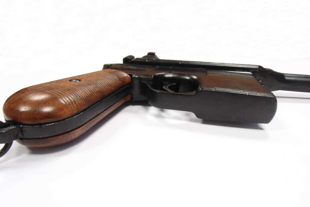 I haven’t bought this replica from this shop, but I have it. The replica is nice it is firm and looks totally authentic, the dry firing cocking and loading sequence is authentic, but the bullet chamber (magazine) doesn’t have a spring inside. You can not load any dummy bullets whatsoever. The sights are movable, but the problem is that, when the hammer is released the sights bounces up, which is a serious flaw for reenactment. But it can be fixed without to much bother. The brake of a pistol is not movable and is not best made, but as a display piece is not noticeable. A fine display piece to be sure, for someone to decorate a house with a replica of a gun that is a symbol of first half of 20th century conflicts. And one of the first automatic pistols.