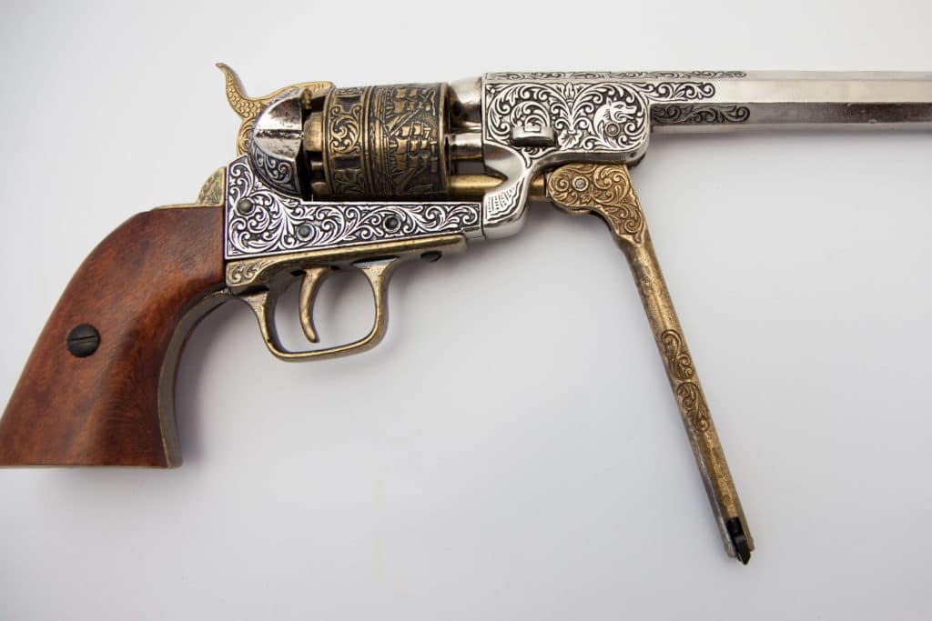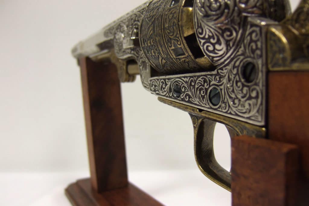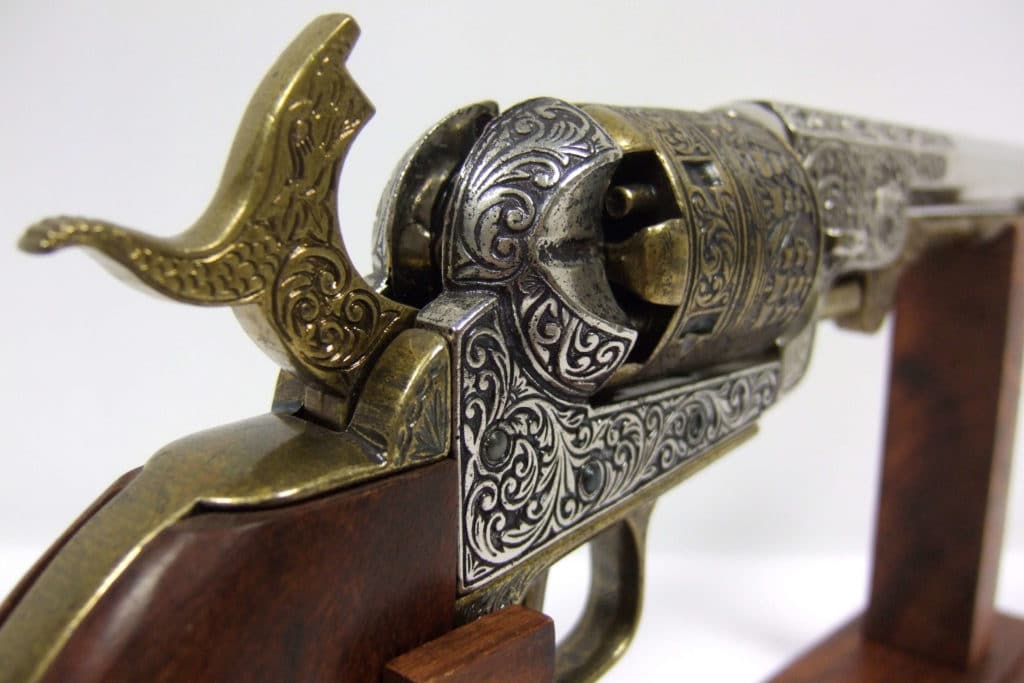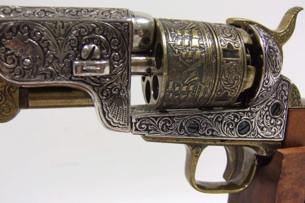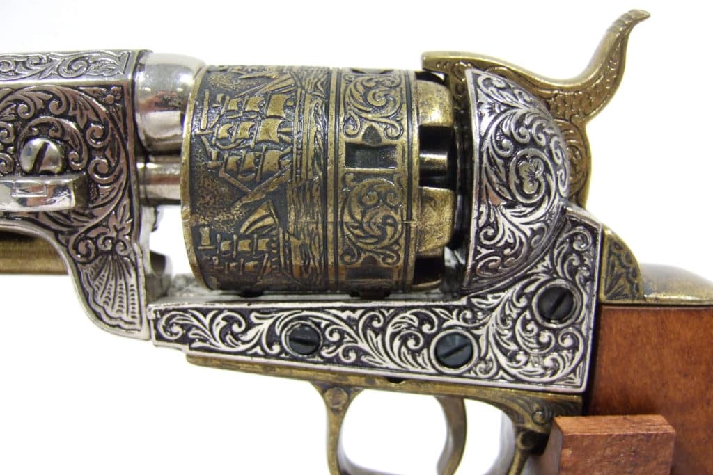 I don’t have this exact model of Colt Navy 1851 but this group of replicas are one of the best Denix replicas in my opinion. The loading sequence of revolver cylinder is authentic. The cocking, and single action cocking is also authentic. There are two cocking positions one for “loading” so a revolver cylinder can spin without obstruction, and the other position for “firing”. The weight is close to authentic. There is also a possibility of putting a priming caps, as with a real weapon.
