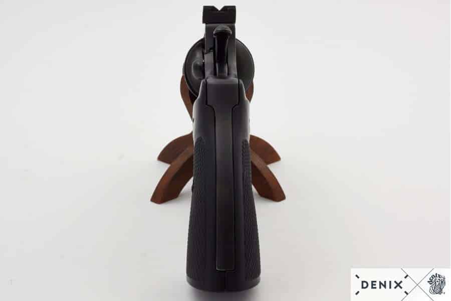 This replica is nice but not perfect of Colt Python. It has double action firing simulation sequence, and it can be cocked. You can’t load dummy bullets inside the chamber. The slide out sequence of a drum is authentic but not smooth. The handle is plastic. And the metal doesn’t satisfy the quality of Colt Phython. But this isn’t credible to say since it is made from Zamak as not to be attempted to make it a firing weapon. A nice display piece and a demonstration piece.