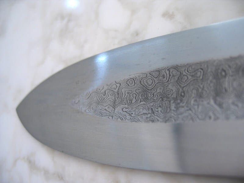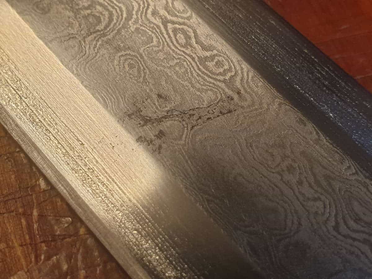 - Terän materiaali: Kuviohitsattua korkean hiilipitoisuuden terästä (eli damascus terästä)