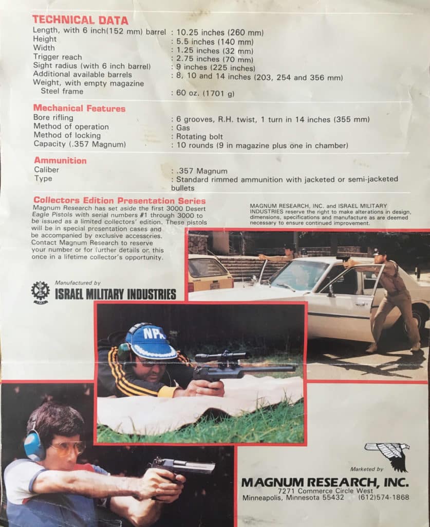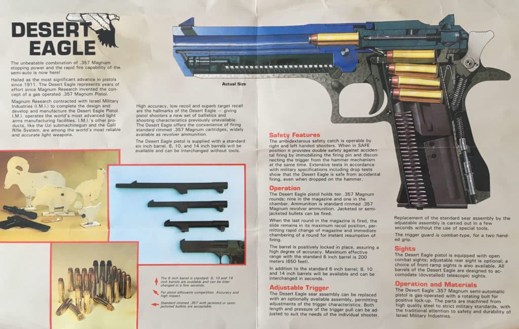 Tämä raskaansarjan pistooli on tuttu näky niin elokuvista, peleistä kuin tv-sarjoistakin. Tämä pistooli tekee esiintymisen mm. pelisarjoissa Grand Theft Auto, Far Cry, Call of Duty ja Counter Strike ja elokuvapuolella tätä pistoolia on päässyt heiluttamaan kaikki toimintaklassikkosankarit Stallonesta Schwartzeneggeriin ja Van Dammesta Bruce Willikseen ja Keanu Reavesiin.