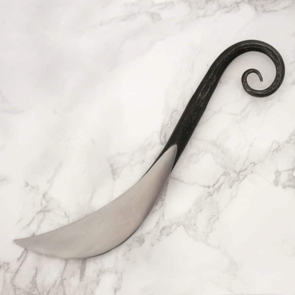 Tämä sirpin muotoinen kaunis pikkuveitsi ei ole suora kopio säilyneestä kappaleesta, mutta on saanut innoituksen ja tyylinsä kelttiaikakauden druideista ja tuolloin käytetyistä veitsistä. Esihistoriallisten aikojen kelttiläiset druidit olivat tunnettuja mistellin ja parantavien yrttien kerääjiä. Ja parhaat yrtit kerättiin tietenkin pyhistä metsistä, kultaisilla sirpeillä kuunvalossa. Todellisuudessa druidit olivat kelttiyhteiskuntien korkealuokkainen kasti, mutta valitettavasti heiltä ei ole säilynyt minkäänlaisia omia kirjoituksia meidän aikoihin saakka ja kaikki mitä druideista tiedetään tulee roomalaisista ja kreikkalaisista teksteistä. Druidit olivat uskonnollisia johtajia, parantajia, sovittelijoita ja tuomareita kelttiläisissä yhteiskunnissa. Muinaisissa teksteissä druideja kuvaillaan viisaiksi tietäjiksi ja velhoiksikin. Kelttiläiset sirpit olivat inspiraationa tämän druidin veitsen suunnittelussa, mutta toisin kuin sirpissä, jossa sisäosa on teroitettu, tässä veitsessä terä on terävä ulkopuolelta.