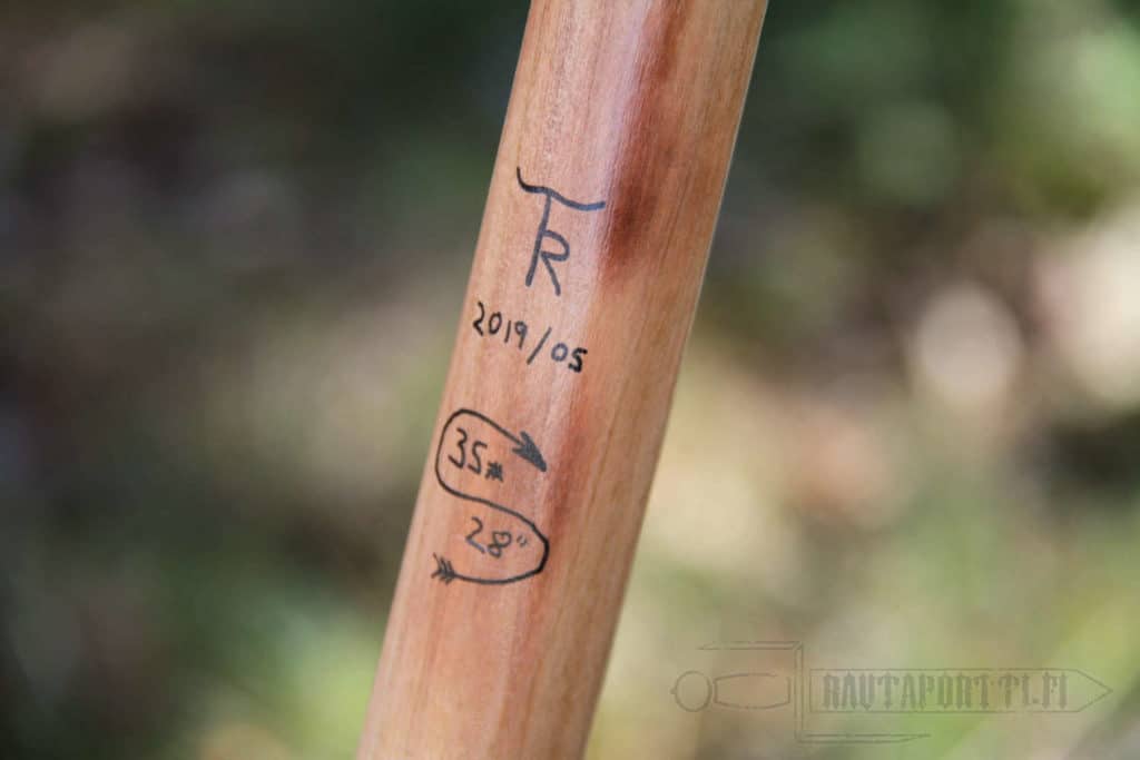 Kokonaispituus noin 194 cm Jäykkyys noin 35 paunaa 28 tuuman (71 cm) vetopituudella Tehty laminoimalla jousen selkään vaahteraa ja vatsaan punajalavaa Nokit vesipuhvelin sarvesta, kahva vihreää puuvillasamettia Valmistettu Suomessa käsityönä