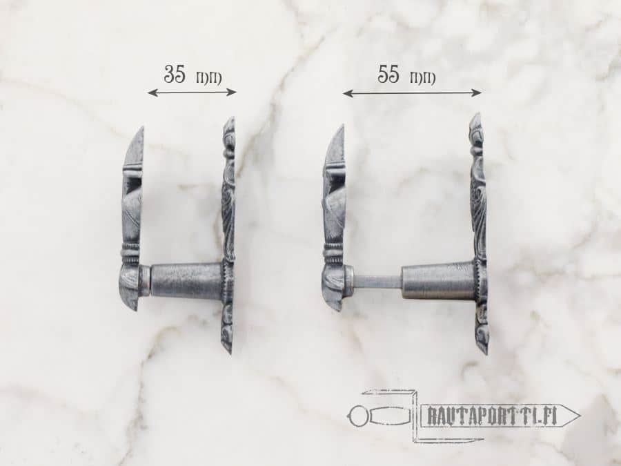 Paketissa kaksi ripustinta, sekä ruuvit ja proput kiinnittämistä varten Liikkuvan etulevyn ja seinän välinen etäisyys minimissään 35 mm ja maksimissaan 55 mm Ripustimen etulevyn korkeus 88 mm Miekan saa ripustettua näiden koukkujen avulla niin pystyyn, vaakaan kuin vinoonkin (esim. kaksi miekkaa ristiin seinälle) Voidaan käyttää monien erilaisten aseiden esillepanoon