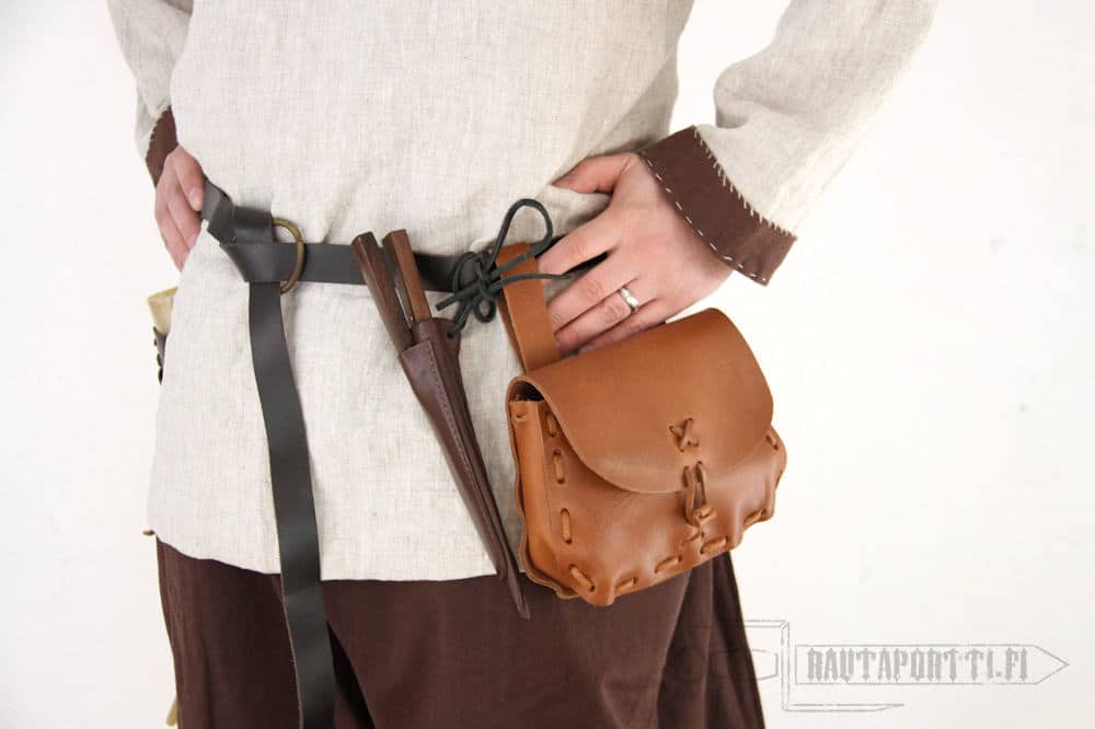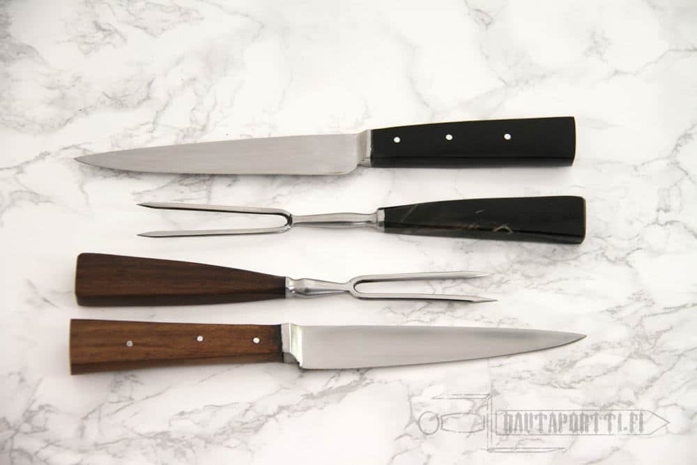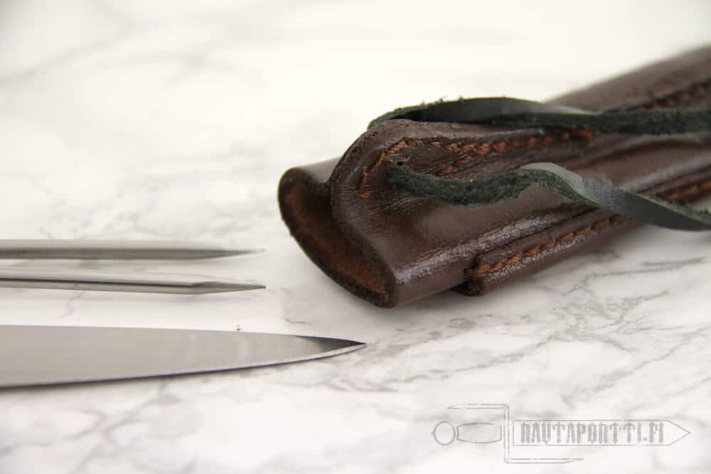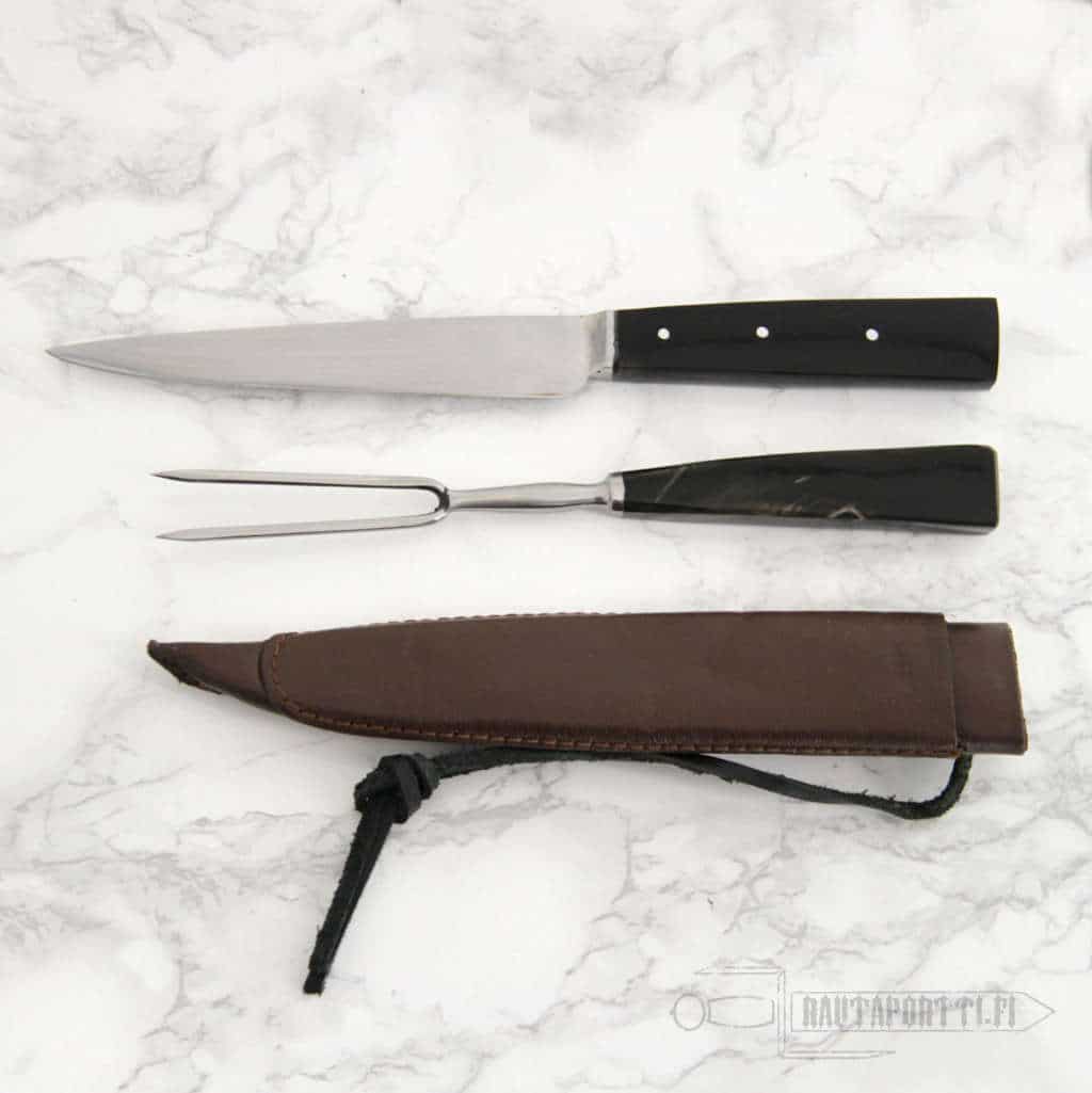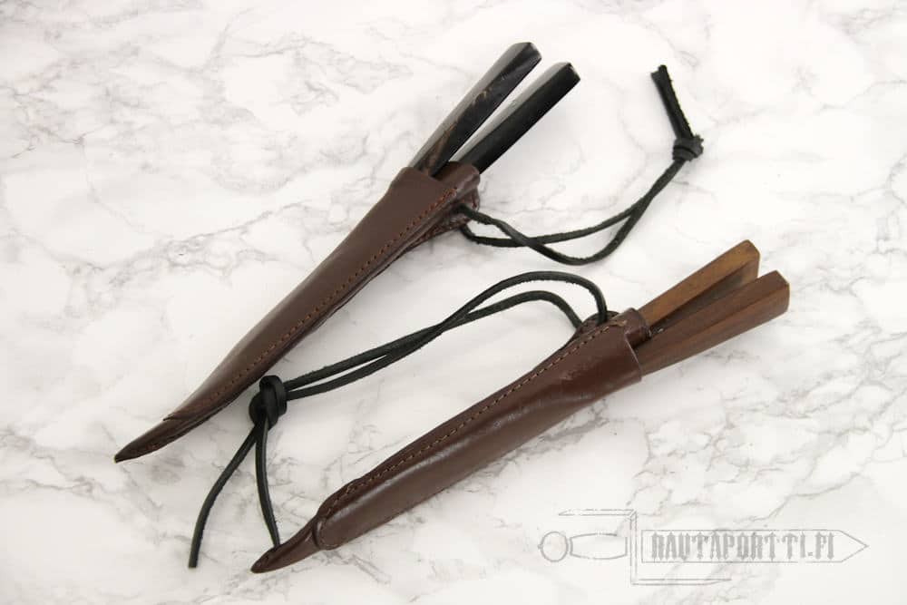 Nämä hiiliteräksiset aterimet saa kuljetettua helposti mukana tulevassa nahkakotelossa ja ripustettua vaikkapa vyölle roikkumaan.