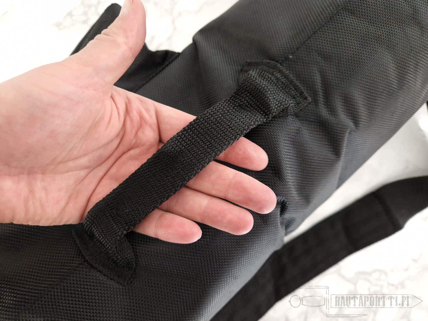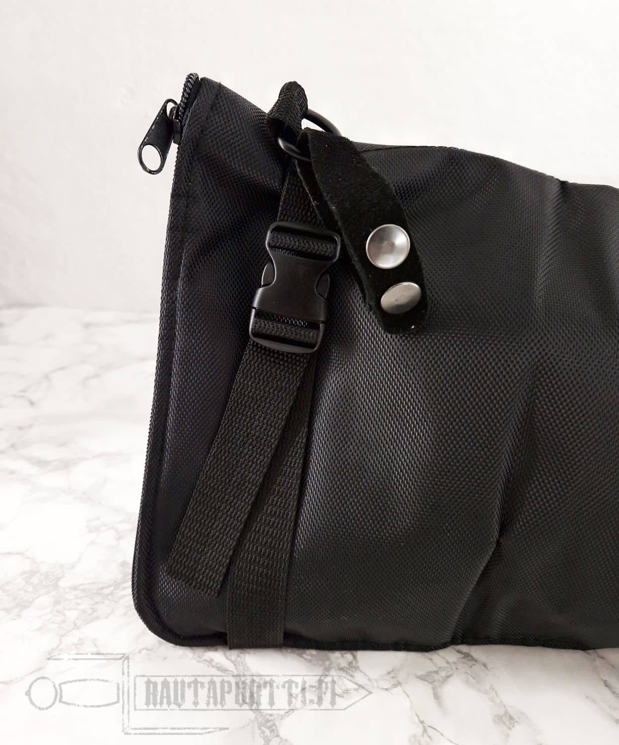 - Valmistettu mustasta tukevasta kankaasta, jossa mokkanahkaiset vahvikkeet