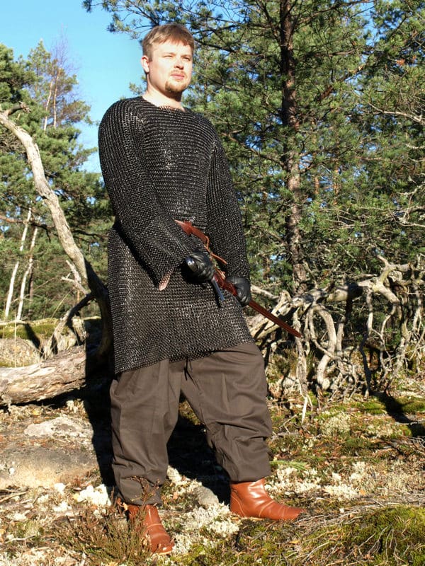 Tämä malli on valmistettu 1,6 mm paksusta teräslangasta taivutetuista renkaista ja on rakenteeltaan perinteinen eurooppalainen rengashaarniska. Haarniskan silmukointi on tyypillistä neljä rengasta läpi viidennestä –tyyliä. Tämä rengashaarniska on kokonaisuudessaan mustattu, joka antaa suojaa ruostetta vastaan. Suosittelemme kuitenkin että pidät tämän rengashaarniskan kevyesti öljyttynä, jos haluat pitää kaiken ruosteen loitolla. Mustaus antaa hyvin suojaa ruosteelta, mutta ei kokonaan estä ruostumissa kaikissa olosuhteissa.
