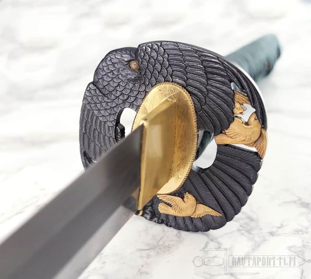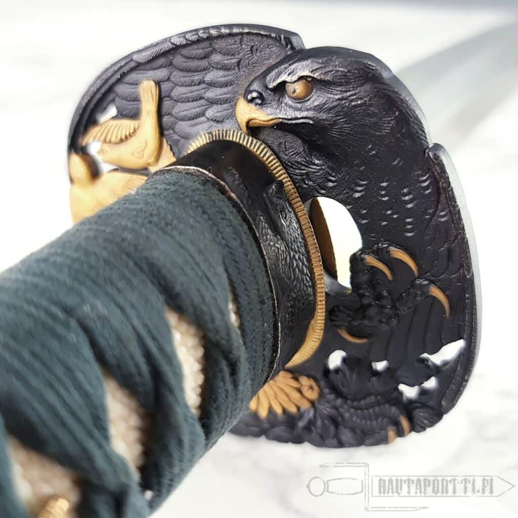 Tämän Hunter Katanan vaikuttava terä on taottu L6/Bainiitti -teräksestä Shinogi Zukuri -terämalliin. Koshirae, eli miekan muut osat terää lukuunottamatta, on erinomaista laatua ja kaikkiaan tämä miekka on niin toimiva ja kestävä ase, kuin loppuunsa viimeistelty ja kaunis mestarisepän taidonnäyte. Hillityn vihreä silkkinen ito ja samaa hillittyä vihreää värimaailmaa oleva raidallinen lakattu saya täydentävät miekkaa. Miekan tsubassa ja muissa kahvan metalliosissa petolintu saalistaa ja väijyy seuraavaa saalistaan. Mustatun tsuban kullatut yksityiskohdat erottuvat hienosti.