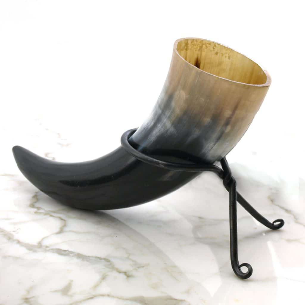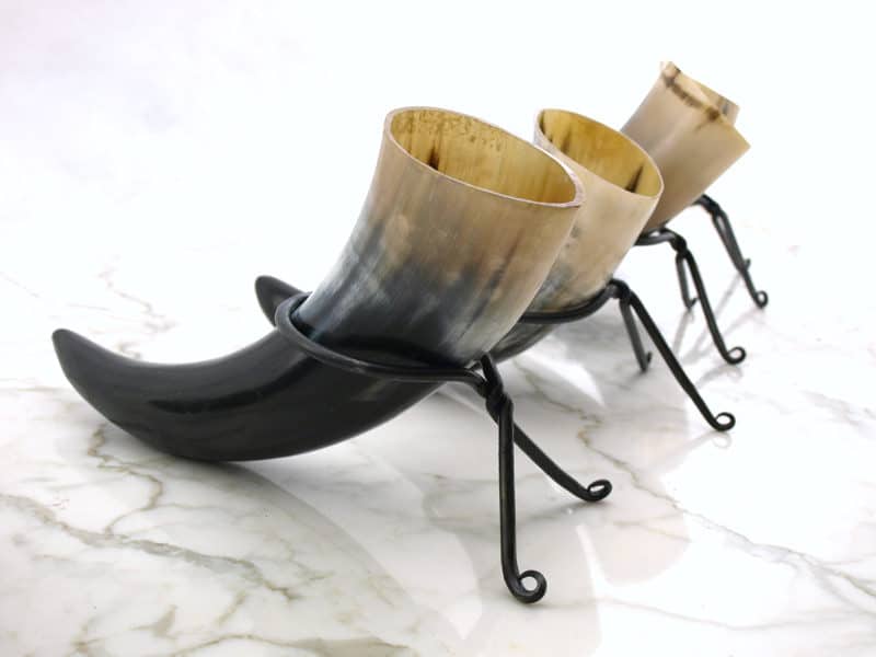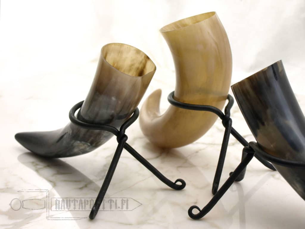Juomingeissa ja syömingeissä juomasarvi saattaa aiheuttaa päänvaivaa, varsinkin ruokailun aikana. Sarven voi toki aina juoda tyhjäksi, mutta paremmaksi ratkaisuksi ehdotamme takorautaista pöytätelinettä johon sarven voi asettaa odottamaan. Tätä takorautaista pöytätelinettä on saatavilla neljässä koossa, joten sopiva koko on saatavilla kaikkiin myymiimme juomasarviin. Tämä käsityönä taottu teline sopii yhtä hyvin käyttöesineeksi kuin koristetarkoituksiinkin, vaikkapa juomasarvien asettamiseen takanreunukselle.