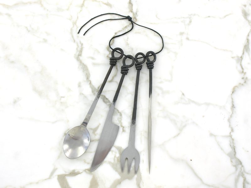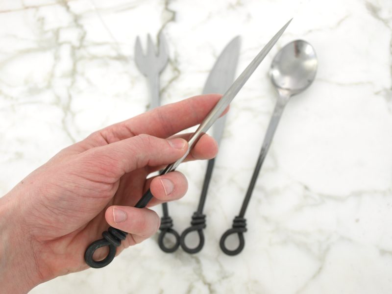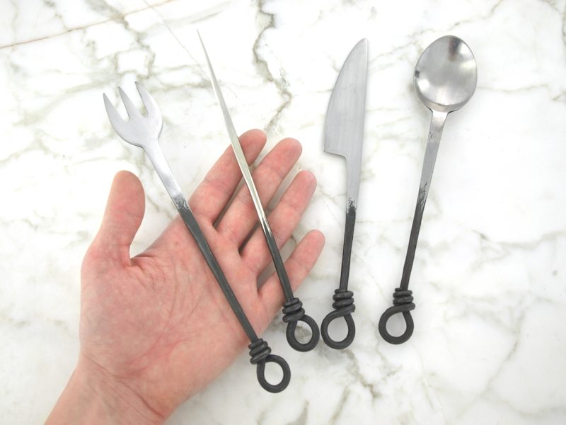 Aterimet on käsintaottu ruostumattomasta teräksestä, eli ne soveltuvat myös moderniin ruokailukäyttöön. Suosittelemme että aterimet pestään huolellisesti ennen ensimmäistä käyttöä. Aterimet saa sidottua helposti yhteen setin mukana tulevalla nahkanarulla ja ripustettua vaikkapa vyölle roikkumaan. Aterinten pituus n. 22 cm.