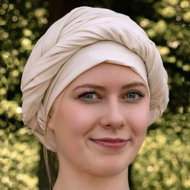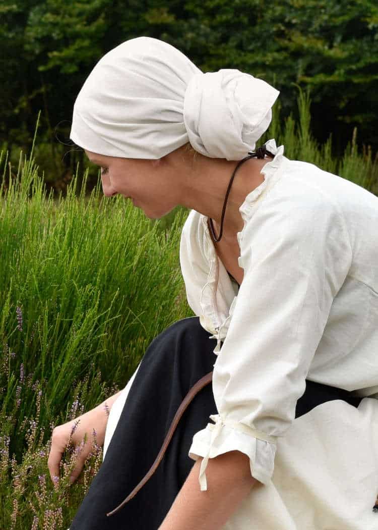 Tämä suorakaiteen mallinen huivi on yksinkertaista puuvillaa. Kankaan reunat on päärmätty. Kangas on suunniteltu käytettäväksi keskiaikaisena päähuivina, wimplenä, mutta se on monikäyttöinen myös modernissa arkikäytössä. Kankaan voi mm. kietoa hiuspannaksi, turbaaniksi tai sitä voi käyttää olka- tai kaulahuivina.