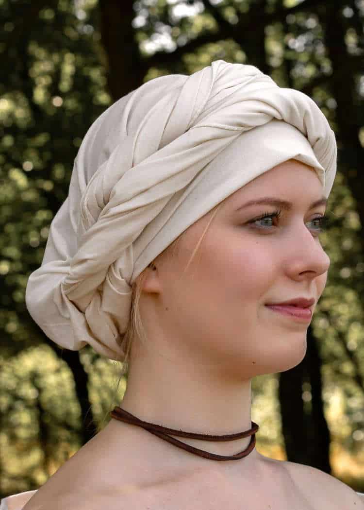 Päähuivin sitomiseen oli monia eri tapoja, mutta yleisimmin se kiedottiin otsan ja leuan ympäri siten, että hiukset jäivät aina peittoon. Historiallisia kuvituksia päähuiveista löytyy mm. teoksesta Weltchronik – Der Stricker – Karl der Große vuodelta 1300 sekä Morganin raamatusta (tunnetaan myös nimellä Maciejowski raamattu), joka on loisteliaasti kuvitettu Raamattu 1200-luvulta.