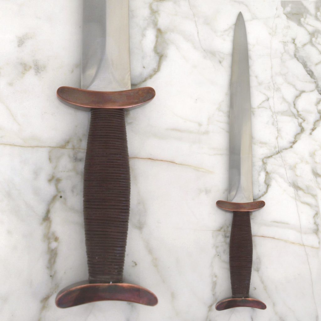 Tämän tyyppisiä tikareita käytettiin ympäri Eurooppaa ja Pyhää maata, ja tällainen tikari saattoi löytyä kenen tahansa ristiretkeläisen kupeelta. Tällaisten tikarien yksinkertainen rakenne sopi erinomaisesti yhteen aikansa rengashaarniskahansikkaiden kanssa. Vastakkaisiin suuntiin kaareutuvat ponsi ja väisti lukitsivat taistelijan paksusti panssaroidun käden mukavasti paikoilleen. Puisen kahvan päälle on kääritty nahkaista nyöriä hyvän otteen varmistamiseksi. Väisti ja ponsi ovat antikoitua pronssia. Tikarin terä on käsin taottu hiiliteräksestä. Nahkainen tuppi antikoiduilla pronssiheloilla sisältyy hintaan.