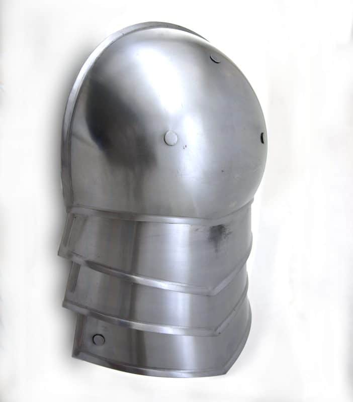 Teräksiset olkapääsuojat yleistyivät 1300-luvun alussa, kun rengashaarniskan päälle haluttiin lisäsuojaa, ja niiden käyttö jatkui yhtä pitkään kuin teräshaarniskoja käytettiinkin. Tämä pelkistetty malli koostuu neljästä limittäisestä teräslevystä. Osat liikkuvat ja liukuvat toistensa suhteen, joten suoja ei estä tai hankaloita käden liikkuvuutta. Olkapääsuoja kiinnitetään käteen kahdella tukevalla nahkahihnalla ja yläpään hihna joko ommellaan, solmitaan tai vaikka niitataan pysyvästi kiinni gambesoniin, rengashaarniskaan tai levyhaarniskaan (rintapanssariin tai kaulasuojaan). 3 mm paksusta nahasta leikatut hihnat toimitetaan suojien mukana. Paketissa suojat molemmille olkapäille.