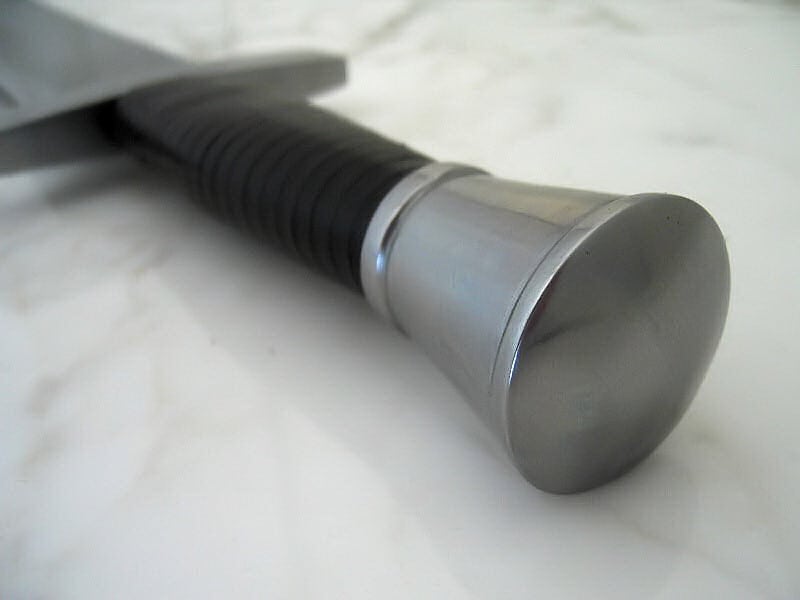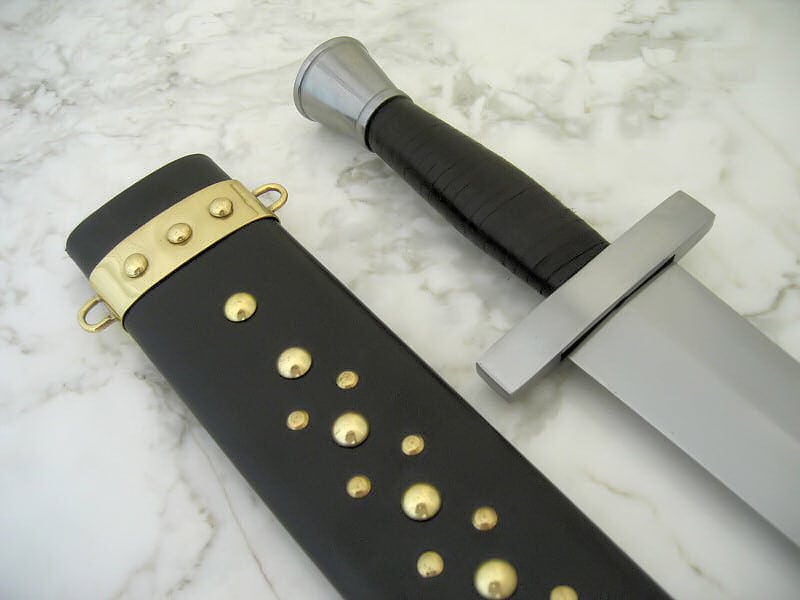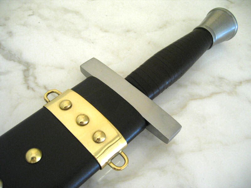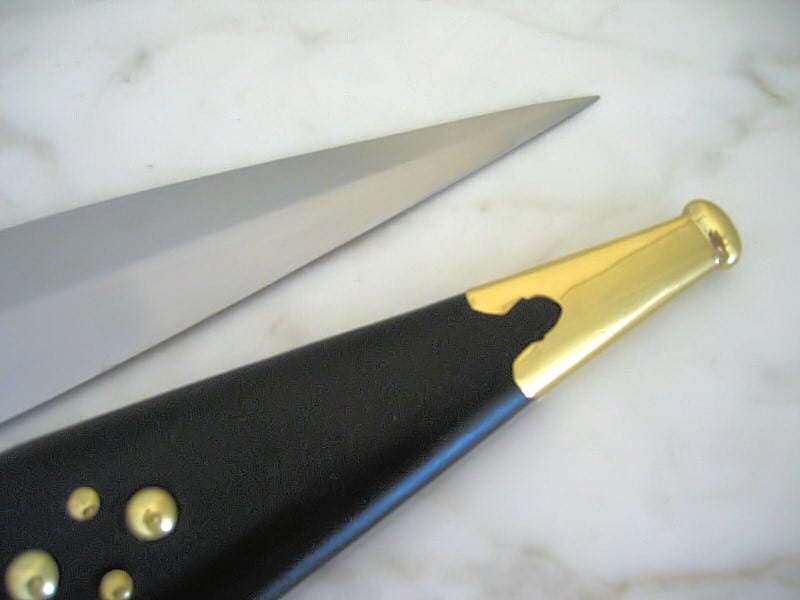 - Mukana nahalla päällystetty puinen tuppi, joka on koristeltu messinkisillä niiteillä
