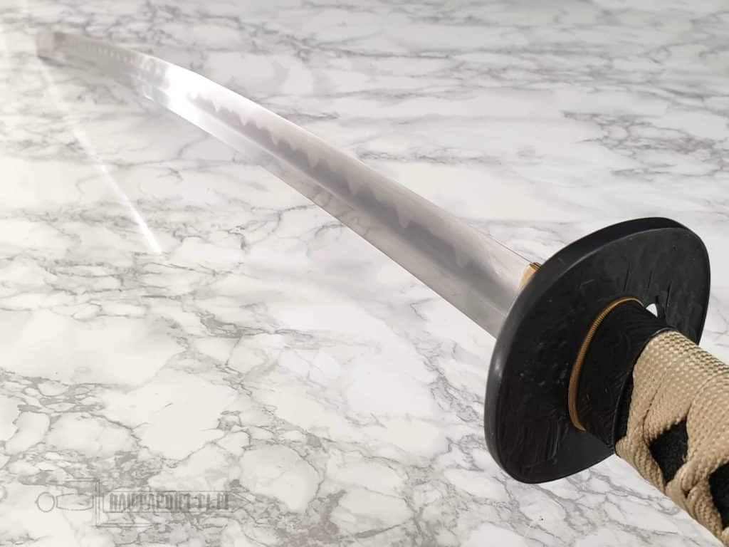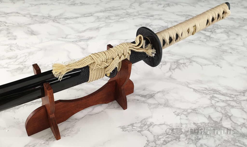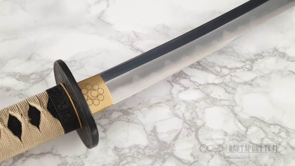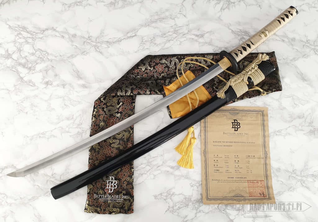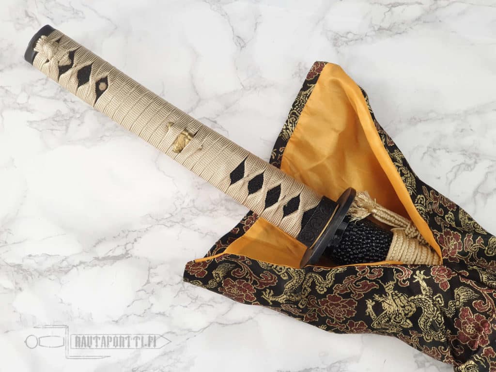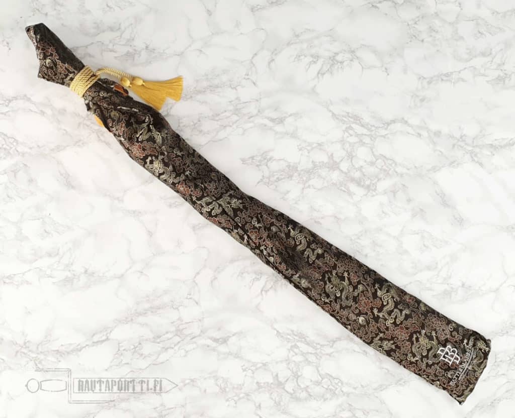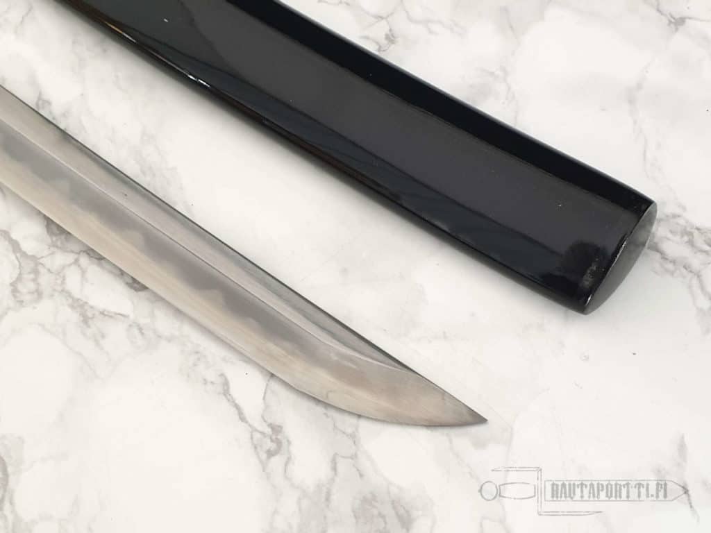 Käsin taottu 1095 hiiliteräksinen terä, Honsanmai kolmen teräksen komposiittirakenne Terässä pitkä kärki O-kissaki Aito savikarkaistu hamon-linja Kahvan ympärillä silkkinyöritys, alla aitoa rauskunnahkaa 24K kultapinnoitettu menuki Koiguchi ja kojiri aitoa puhvelinsarvea Toimitetaan alkuperäistodistuksen ja silkkisen miekkapussin kanssa Kokonaispituus: 104,5 cm Paino tupen kanssa 1,5 kg