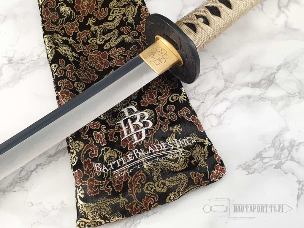 Mukana tulee brodeerattu BattleBlades Inc:n silkkinen miekkapussi ja aitoustodistus.