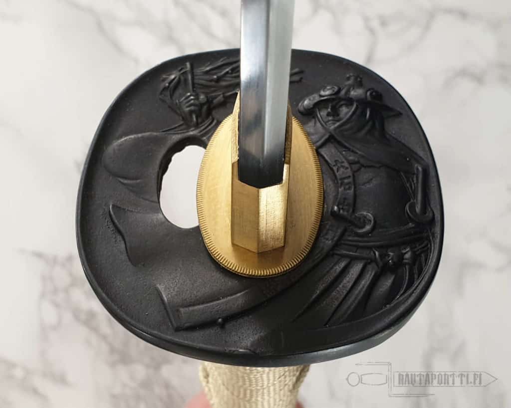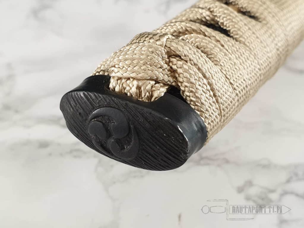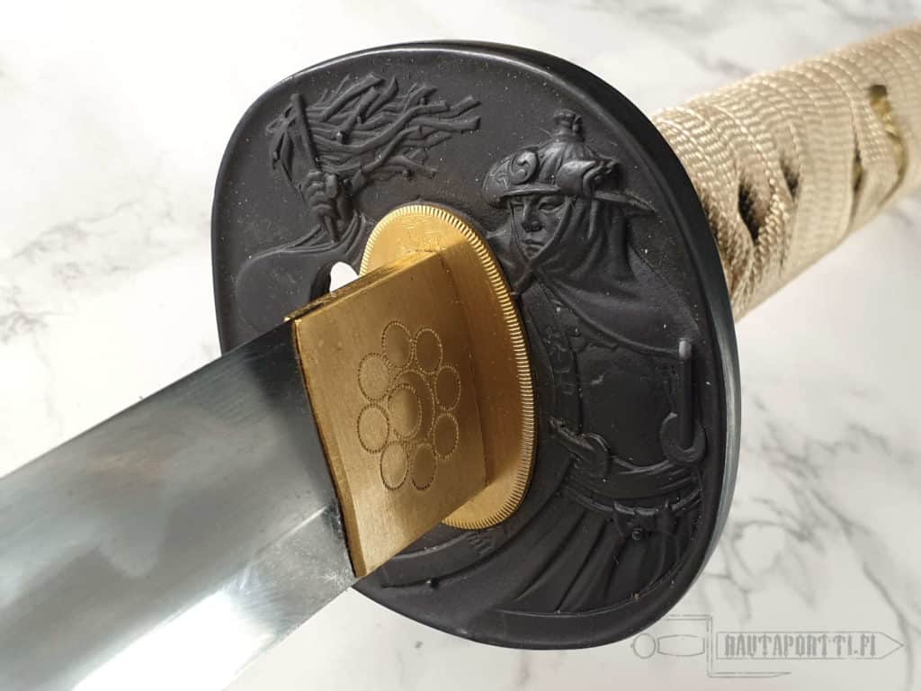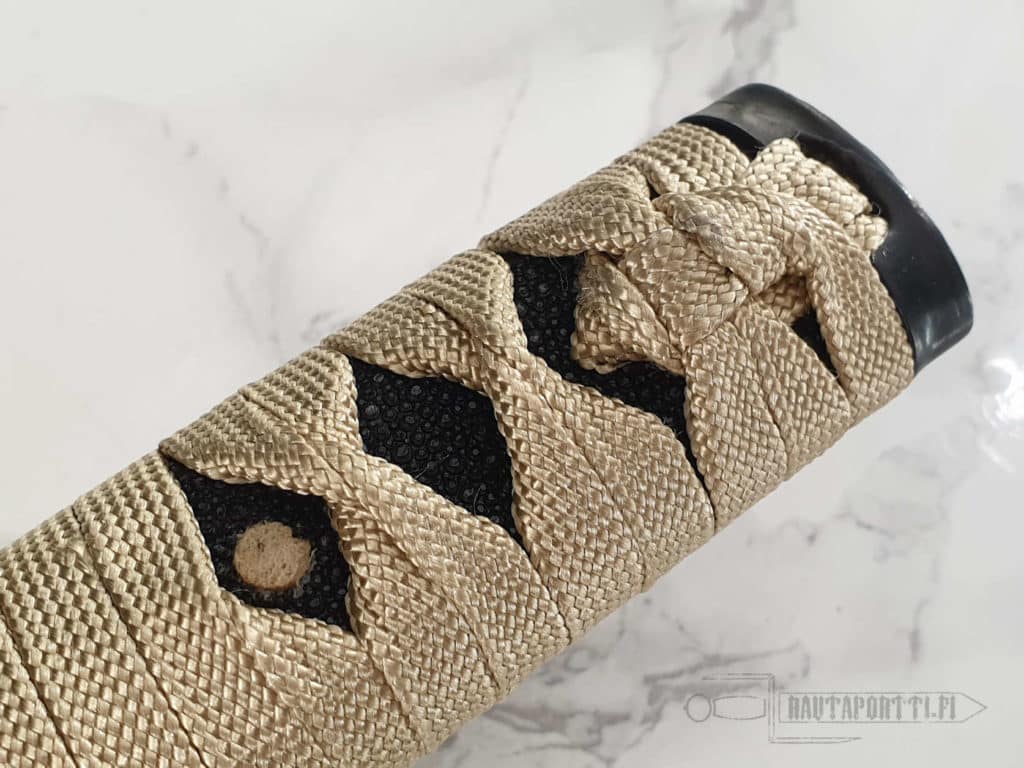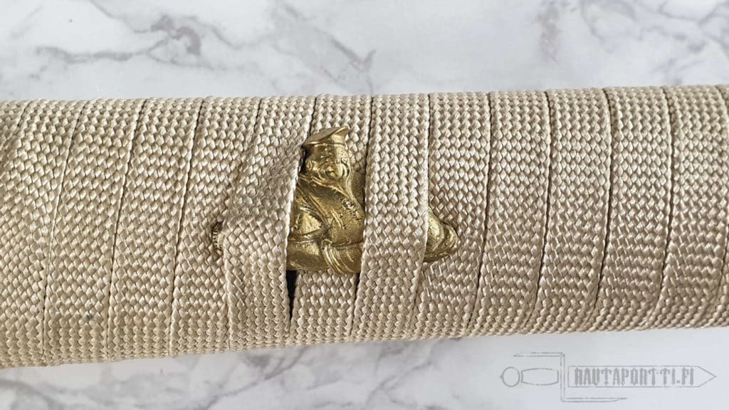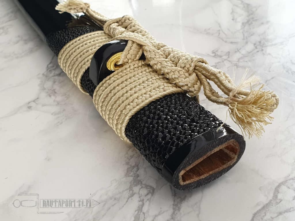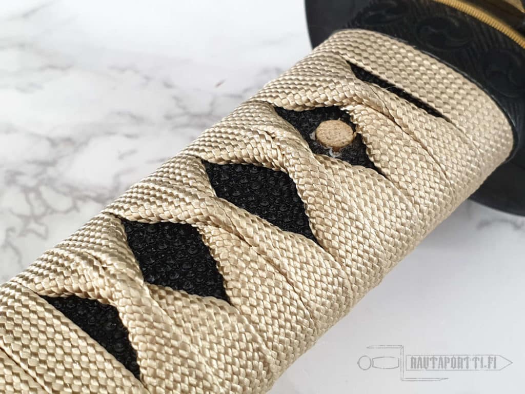 Kovapuinen kahva on katatemaki-kääritty tyylikkäällä kullanvärisellä premium-silkillä. Tämän tsuka-iton alla on aitoa mustaa rauskunnahkaa. Kahvaa koristavat 24 karaatin kullalla kullatut menukit. Tsuba, kashira ja fuchi ovat rautaa.
