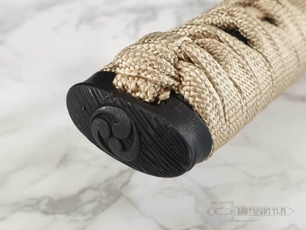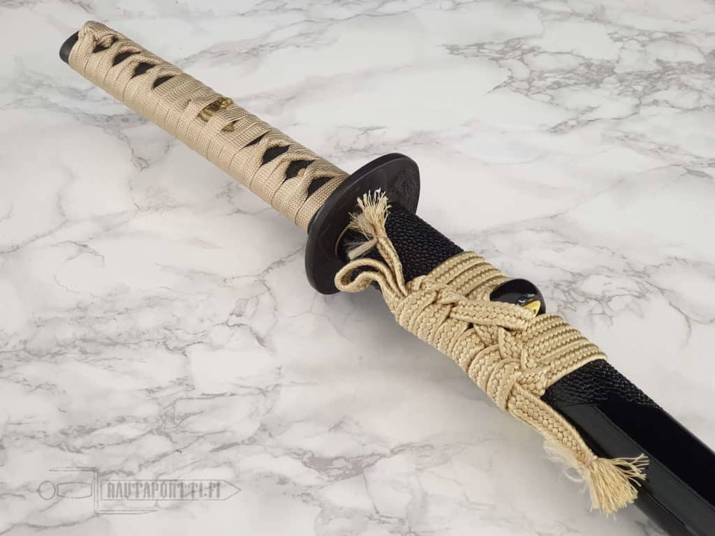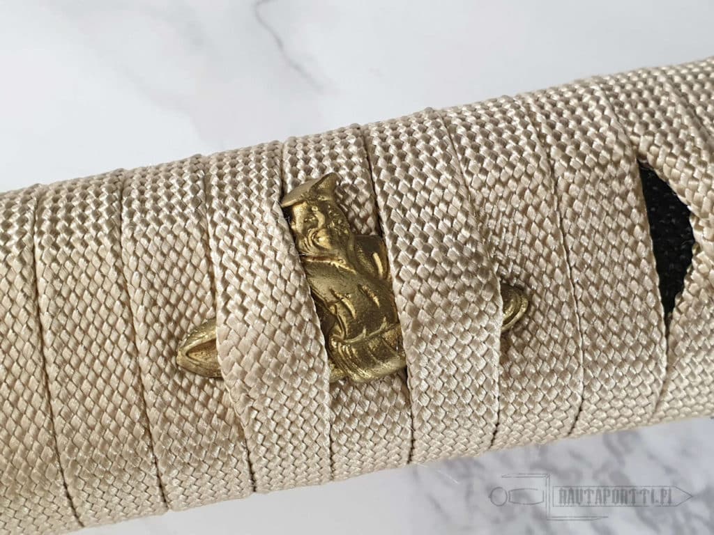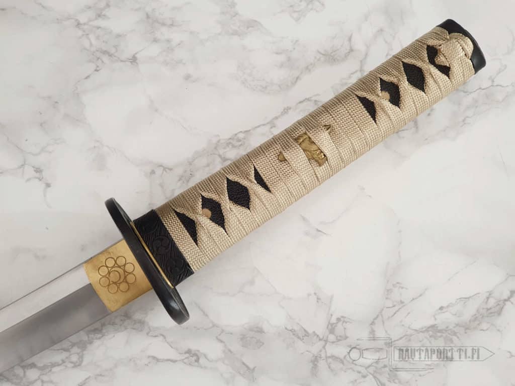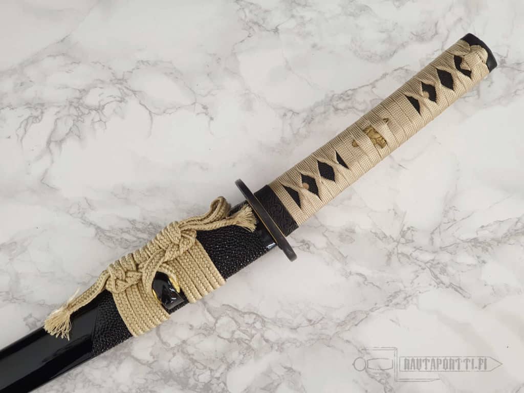 Kovapuinen kahva on katatemaki-kääritty tyylikkäällä kullanvärisellä premium-silkillä. Tämän tsuka-iton alla on aitoa mustaa rauskunnahkaa. Kahvaa koristavat 24 karaatin kullalla kullatut menukit. Tsuba, kashira ja fuchi ovat rautaa.