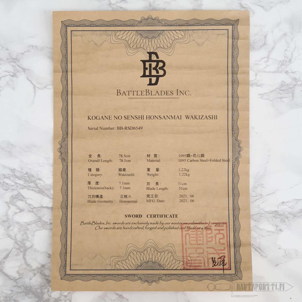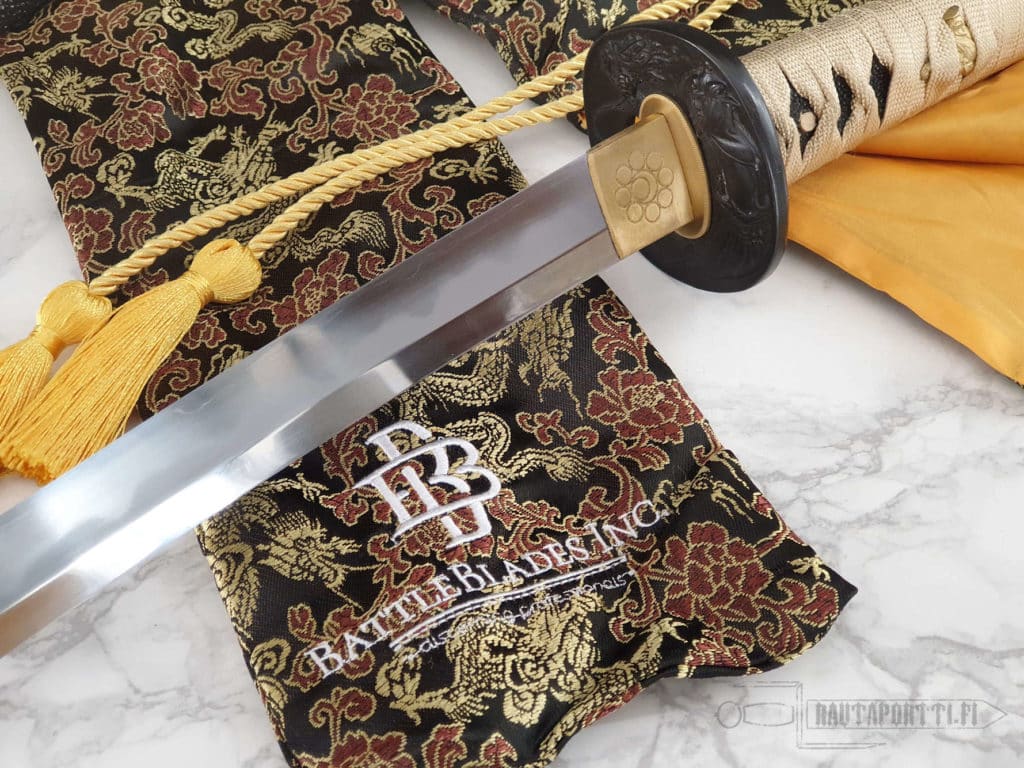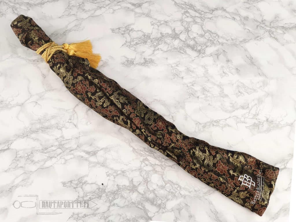 Mukana tulee brodeerattu BattleBlades Inc:n silkkinen miekkapussi ja aitoustodistus.