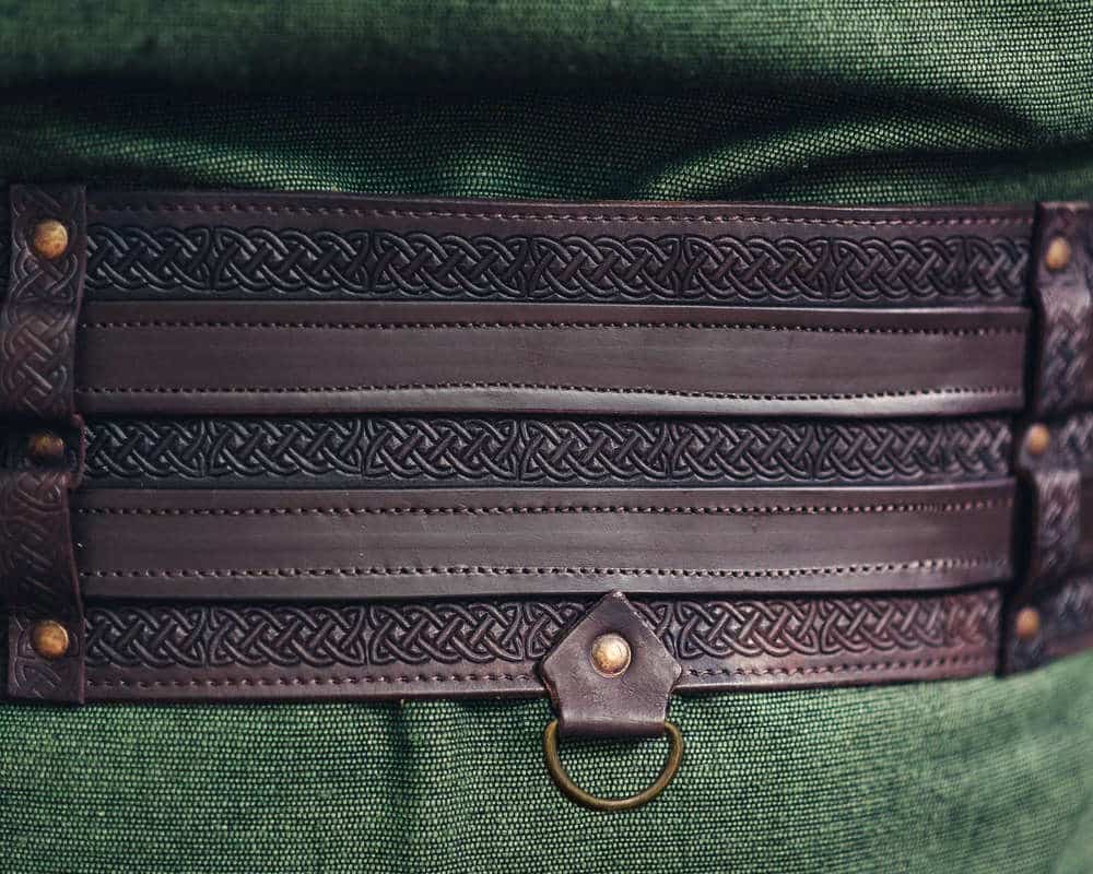 Tämä vyö on kohokuvioitu kauttaaltaan solmuornamenteilla, jollaiset olivat suosittuja niin kelttikulttuurissa kuin viikinkiajan skandinaviassakin. Vyössä on kolme puoliympyrän muotoista metallista kiinnitysrengasta tarvikkeiden kiinnitykseen. Metallilenkkeihin saat ripustettua helposti niin veitset, pussit kuin muutkin tärkeät mukana kuljetettavat pikkutarvikkeet ja aseet.