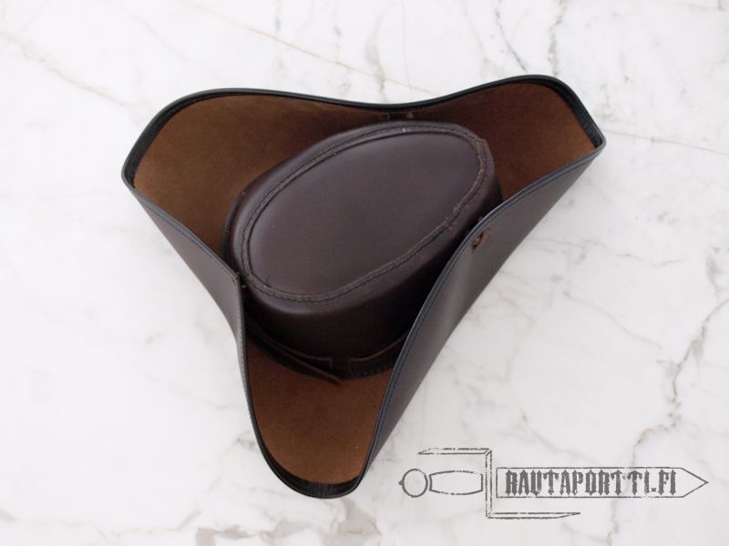 Hatussa on leveä lieri, jonka voi itse taittaa ylös ja kiinnittää mukana tulevilla nahkanyöreillä.