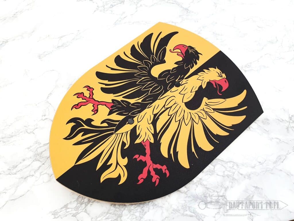Tämän musta-keltaisen kilven pintaa koristaa kotkan kuva. Kotkan olivat keskiajalla yleisiä symboleita, ovathan nämä taivaan kuninkaat voimakkaita ja mahtavia eläimiä ja siten mainioita merkkejä ritareille tai hallitsijoille.