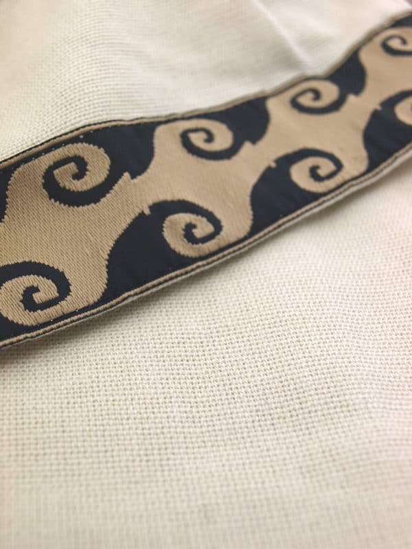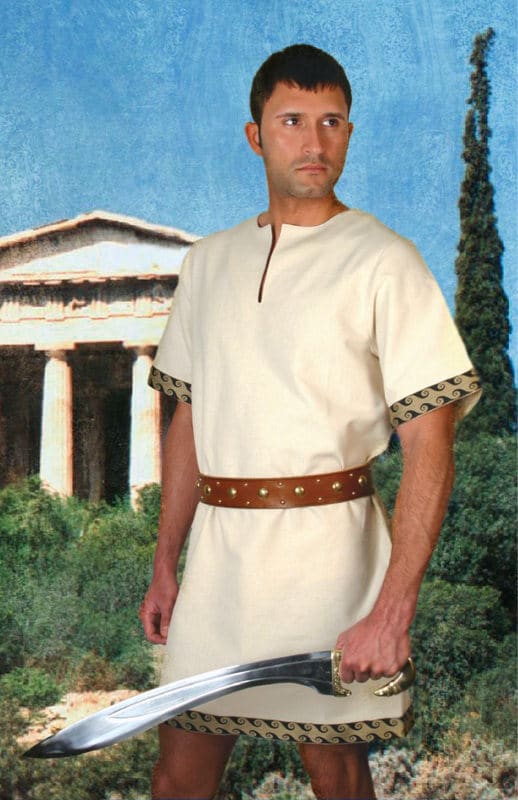Niin naisten kuin miestenkin tavallinen arkiasu antiikin Kreikassa oli roomalaista tunikaa muistuttava chiton, jota käytettiin arkaaisen kauden ensimmäisiltä vuosisadoilta aina myöhäishellenistiselle ajalle asti. Alunperin chiton tehtiin ompelemalla yhteen kaksi suorakulmion muotoista kangaspalaa niin, että päälle ja käsille jätettiin aukot. Myöhemmin malli muuttui, kun kädensuihin lisättiin puolipitkät hihat, ja vyötärölle yleensä sidottiin vyö. Myymämme malli on tällainen myöhäisemmän kauden chiton, jonka hihansuita ja helmaa koristaa Egeian meren aaltoja kuvaava koristeellinen nauha. Kuvassa näkyvä vyö ei sisälly hintaan. Tämä luonnonvalkoinen tunika on 100 % puuvillaa.