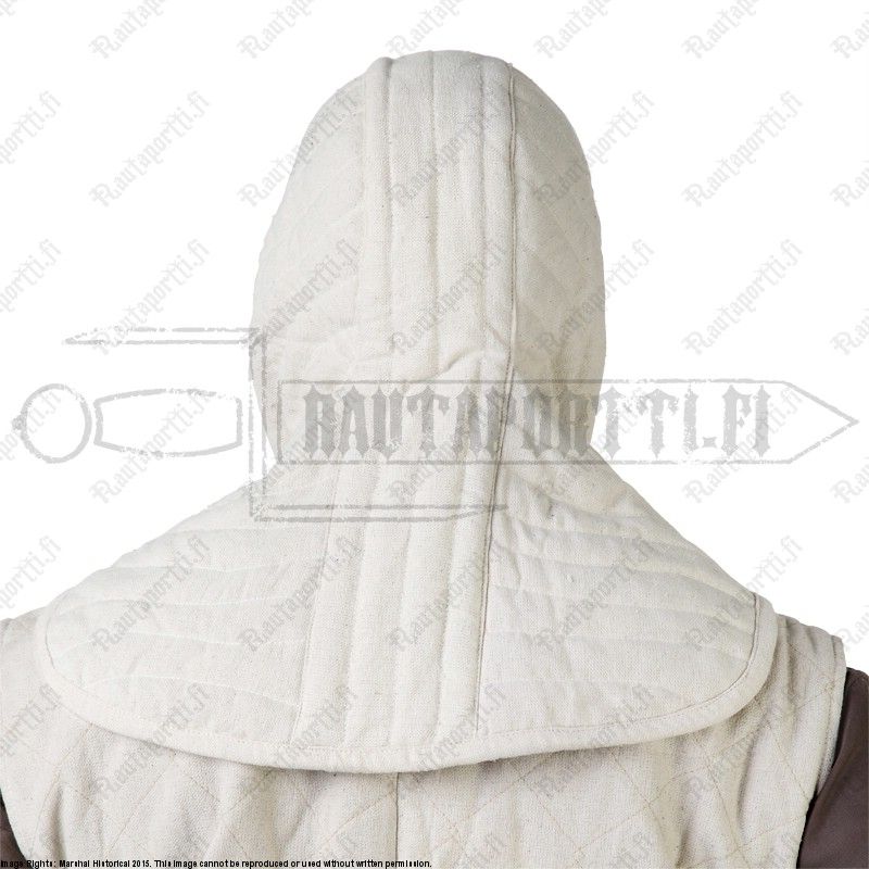 malli sopii niin ritarin kuin minkä tahansa muunkin soturin päähän. Hupun iso, olkapäille laskeutuva kaulus antaa lisäsuojaa kaulan, niskan ja hartioiden alueelle ja on omiaan isojen olkapäille ulottuvien kypärien, kuten bascinettien, alle. Suojahuppua voi käyttää useimpien kypärämallien alla tai ilman kypärää. Täydellinen lisä historianelävöittäjien ja keskiaikaharrastajien puvustukseen.