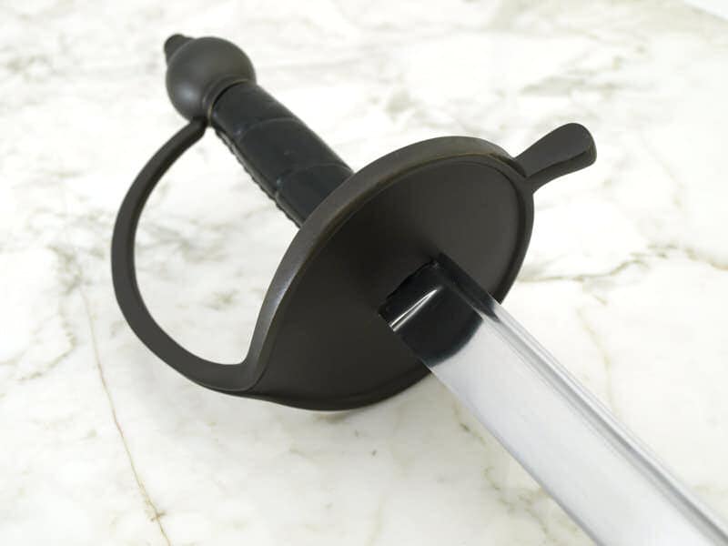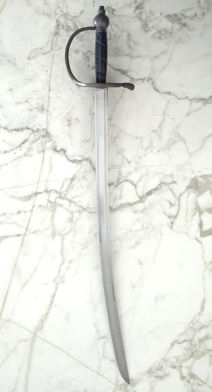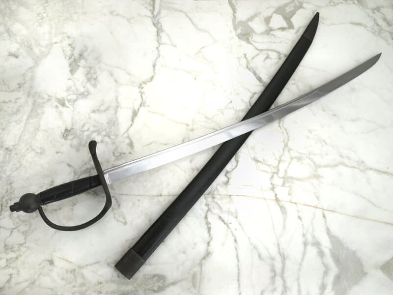 Tämän kauniin miekan kahvaosat on valmistettu antikoidusta messingistä, materiaalista, joka ei ruostunut suolaisten merien myrskyissä. Merirosvot suosivat tällaisia lyhyempiä yksiteräisiä miekkoja aseinaan. Paksuselkäisellä miekalla pystyi taistelun lisäksi leikkaamaan paksuja köysiä, purjekangasta ja puuta. Lyhyellä miekalla oli helpompi laivan valtauksissa taistella ahtaissa tiloissa ja kannen alla. Eurooppalainen merirosvous kukoisti 1500–1700-luvuilla suurvaltojen palkatessa palkkarosvoja toisten valtioiden alusten ja siirtokuntien ryöstelyyn. Taistelu siirtokunnista oli veristä ja kaikkia mahdollisia temppuja käytettiin niin Länsi-Afrikassa, Intian valtamerellä kuin Karibiallakin. Laadukas hiiliteräksinen terä on kokonaisuudessaan karkaistu ja lämpökäsitelty. Kuvissa näkyvä nahkainen tuppi sisältyy hintaan.