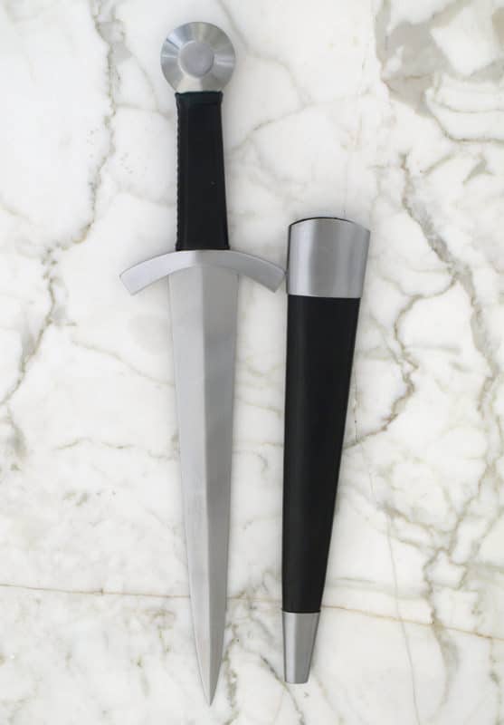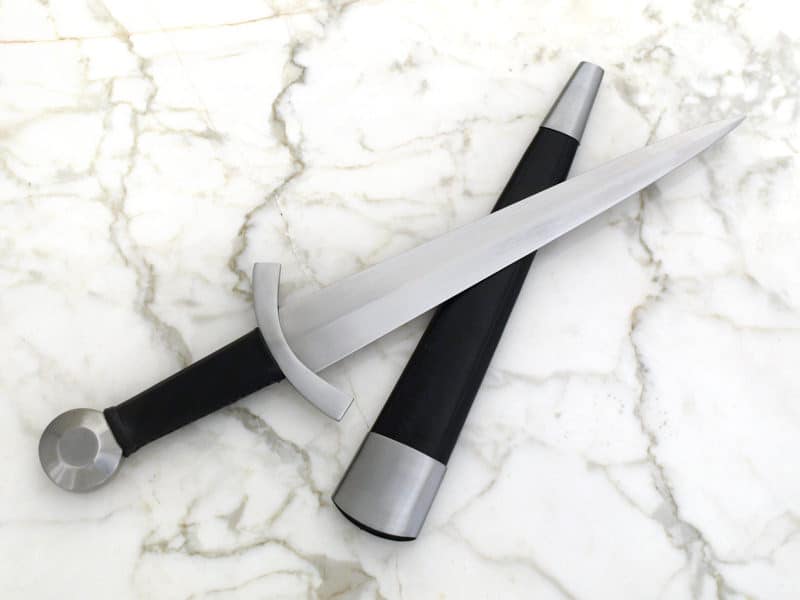 Tällaisia isoja tikareja kantoivat mukanaan tyypillisesti ritarit ja muut sotilaat. Vaikka isoa tikaria käytettiinkin leirissä kaikenlaiseen yleistyöhön, tällaisen ison tikarin pääasiallinen tarkoitus löytyy taistelukentältä. Iso miekkakahvainen tikari oli tukeva ja luotettava vara-ase, ja jos kilpeä ei ollut syystä tai toisesta saatavilla, vasempaan käteen valittiin reilun kokoinen tikari oikean käden miekan avuksi. Terää kohti kaartuva väisti ja kiekkoponsi ovat klassiset muodot aikansa tikareissa. Puinen kahva on päällystetty nahalla. Tikarin mukana toimitetaan kuvissa näkyvä teräshelainen nahkainen tuppi. Terä on käsin taottu laadukkaasta hiiliteräksestä. Alkuperäinen malli 1200-luvulta.