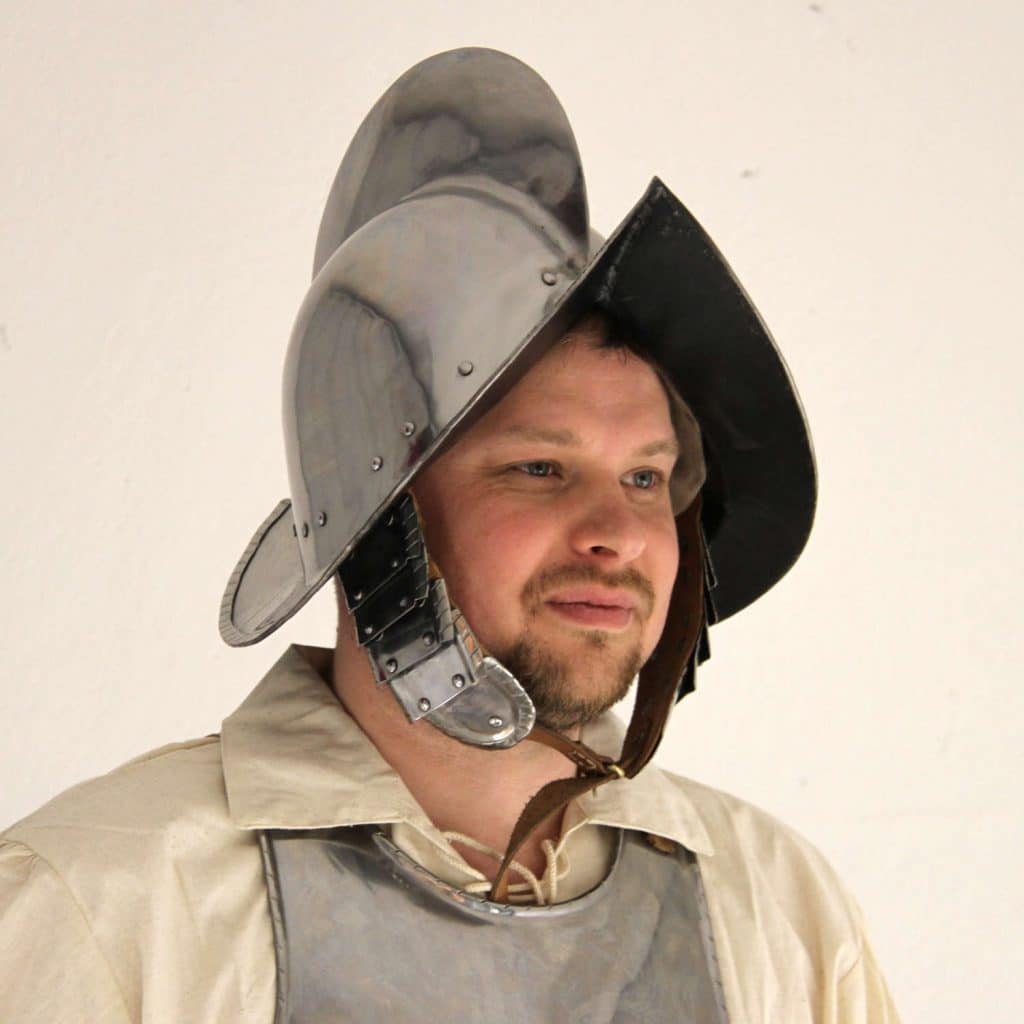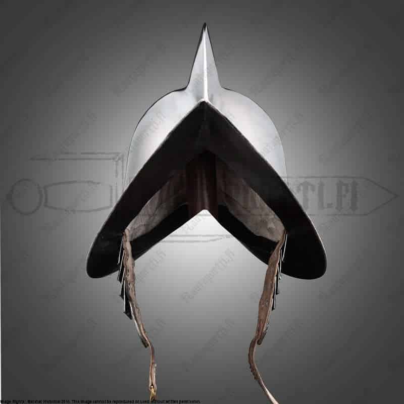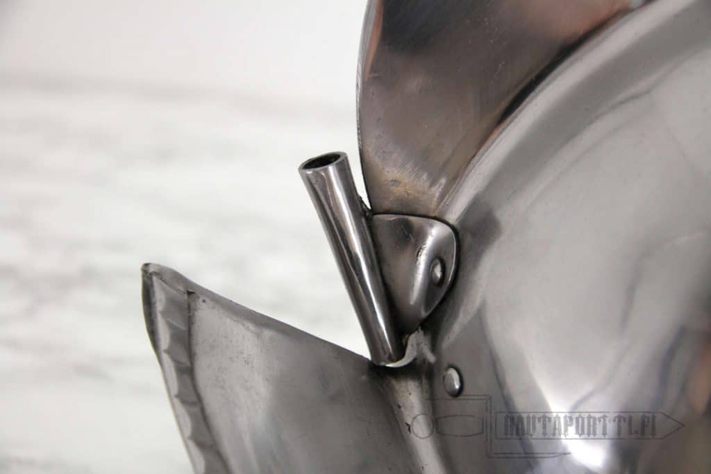 - Ajalle tyypillisesti tässä kypärässä on poskilevyt, joita käytettiin tuomaan lisäsuojaa kasvojen ja kaulan alueelle