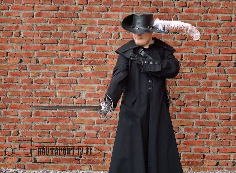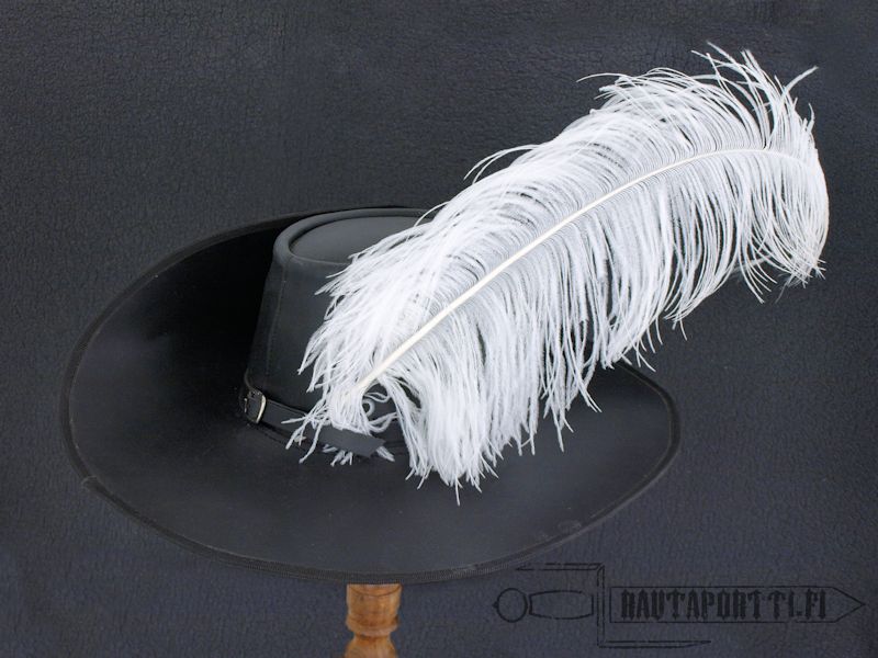 Tämä tyylikäs hattu viimeistelee asusi loisteliaasti oletpa sitten uskollinen monarkialle tai parlamentille ja riippumatta siitä, puolustatko kardinaalia vai kuningasta. Hattu on tehty mustasta korkealaatuisesta nahasta, siinä on tyylikäs solkivyö ja maineikas ylös käännetty lieri. Hattua voi käyttää joko oikea tai vasen lieri ylös käännettynä.