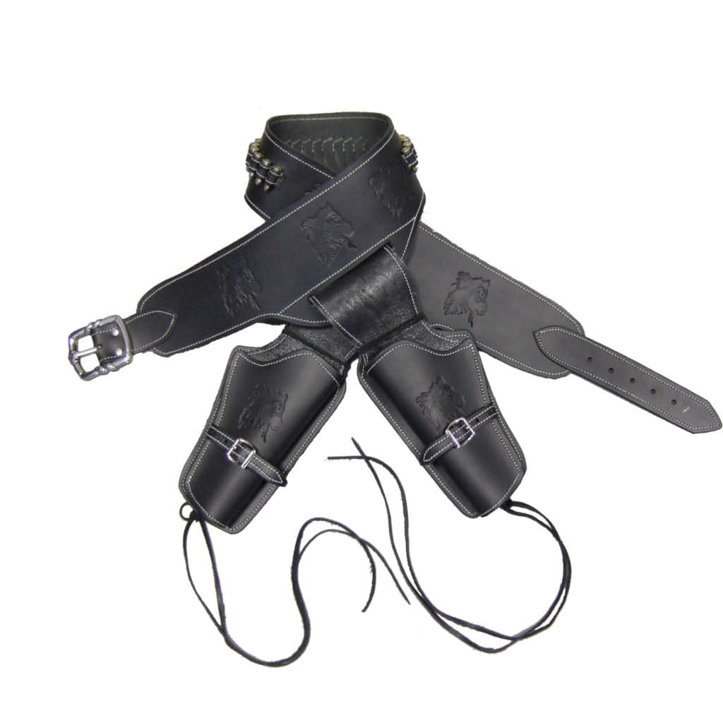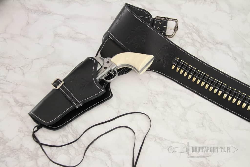 Tyylikäs nahkainen asevyö, joka sopii niin lehmipaimenen, sheriffin kuin Meksikon puolelle karanneen pankkirosvonkin lonkalle. Tässä mustassa asevyössä kulkee mukana mitkä tahansa kaksi valikoimasta löytyvää Colt .45 Peacemaker -revolveria. Koska myymämme replikat ovat oikean kokoisia, voi tätä asevyötä tietysti käyttää myös oikeiden revolverien kanssa.