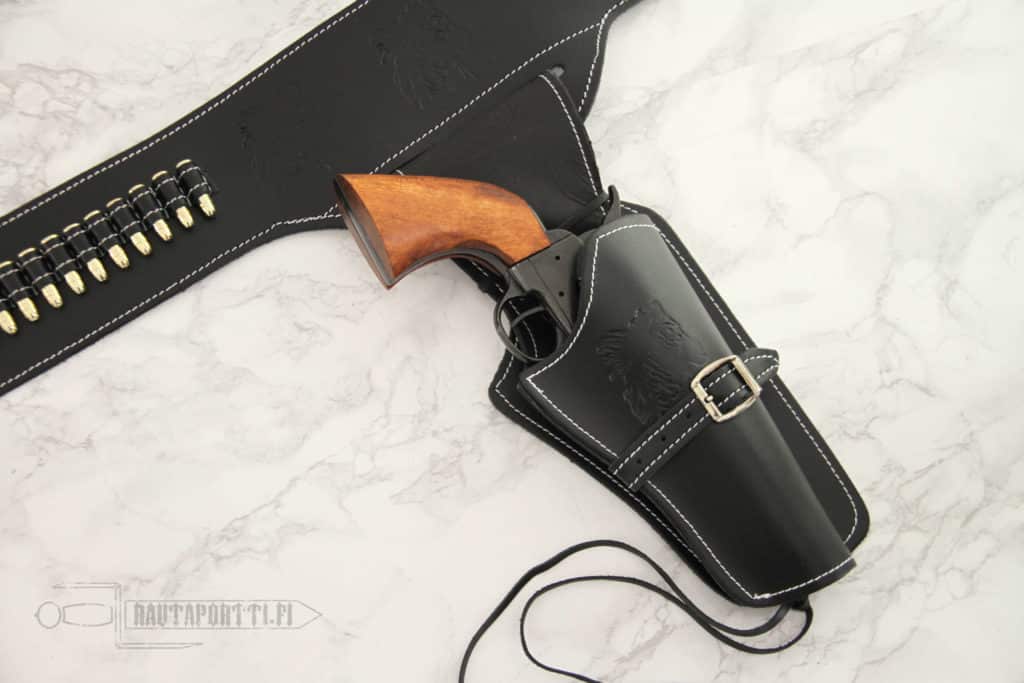 Revolverikotelossa on ulkopuolella oma soljellinen nahkahihna, jolla kotelo sovitetaan juuri sopivalle tiukkuudelle omalle revolverillesi. Ethän halua että luotettava kuudestilaukeavasi putoaa kotelosta vesitynnyrin taakse sukellettaessa tai että kotelo olisi liian tiukka ja nappaa kiinni kun yrität vetää revolverisi mahdollisimman nopeasti kaksintaistelun alkaessa.