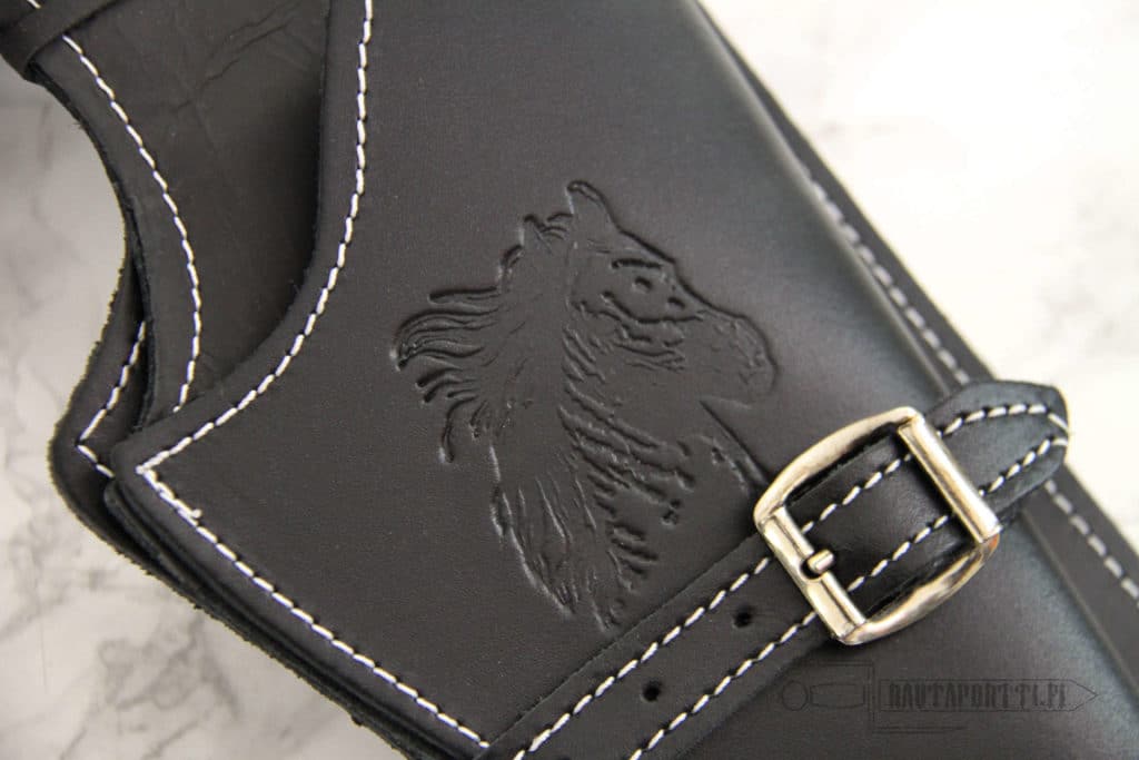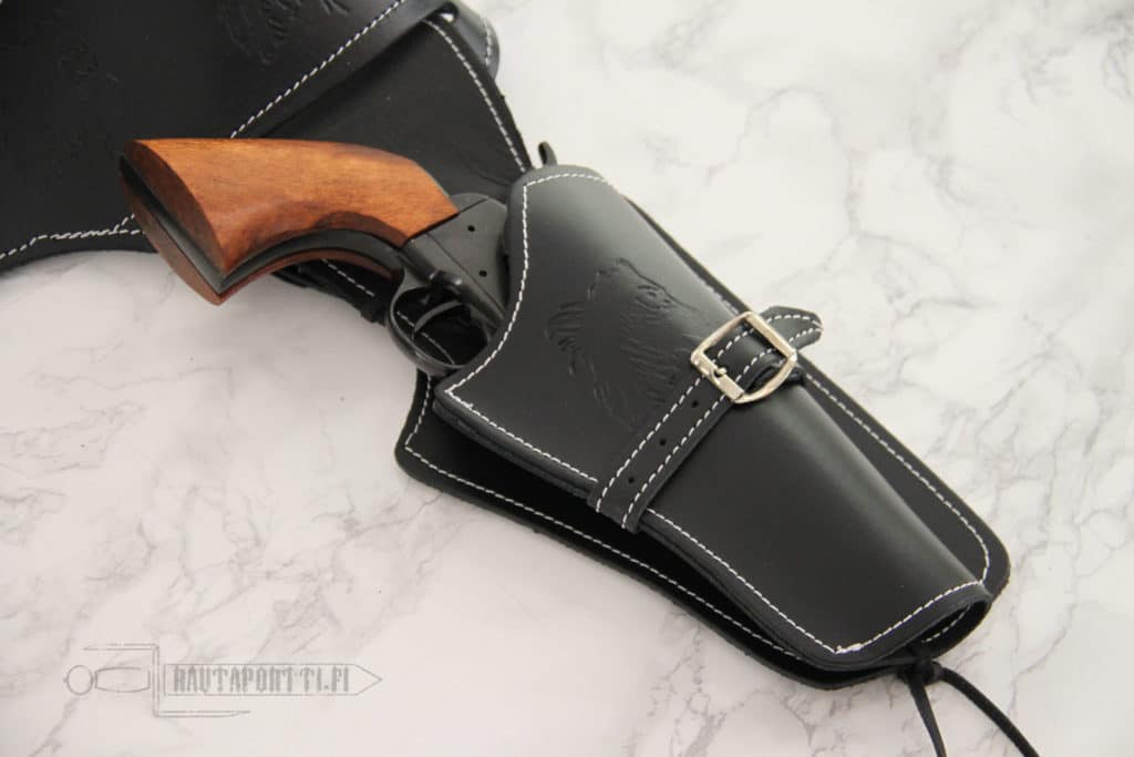 Revolverikotelon alareunassa on nahkahihna, jolla kotelon saa solmittua alareunasta reiteen kiinni. Tällöin ase ei pääse heilumaan edestakaisin laukatessasi takaa-ajon tiimellyksessä tai juostessa.