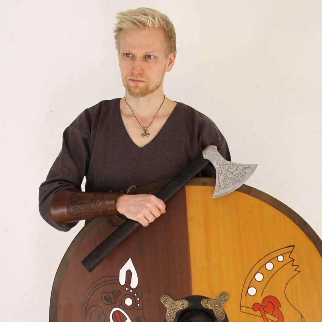 Tämä käsivarsisuoja on koristeltu kohokuvioidulla Thorin vasaralla, Mjölnirillä. Thor oli skandinaavisessa mytologiassa sekä vapaiden maanviljelijöiden että soturien lempijumala. Tarinan mukaan kääpiöt Brokkr ja Sindri takoivat Mjölniristä aseen, joka ei koskaan osunut ohi kohteestaan, vaan sillä saattoi kaataa niin jättiläisiä kuin murtaa vuoriakin.