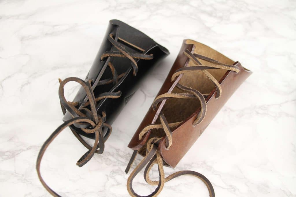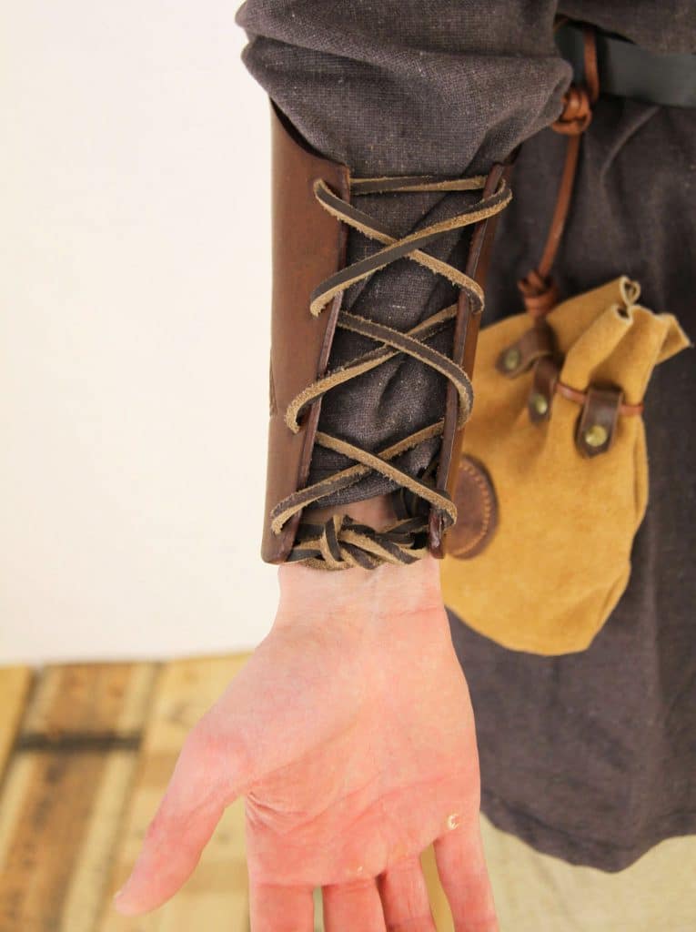 Tämä käsivarsisuoja on valmistettu laadukkaasta 3 mm paksusta nahasta. Nahkainen käsivarsisuoja ei paina juuri mitään eikä haittaa miekkailijan liikkuvuutta, joten se on mukava ja kevyt käyttää pitkiäkin aikoja. Sopii eri aikakausien ja tyylien asuihin aina viikinkisoturista fantasia-asuihin. Tämä malli on suunniteltu historian elävöittämista varten pidettäväksi vaatteiden/pehmusteiden päällä ja on mitoitettu kooltaan tarpeeksi suureksi tätä varten. Paksu, tukeva ja kova nahka suojaa kättä miekan sipaisuilta ja huonoimmilta lyönneiltä, ja se soveltuu suojaksi niin pehmomiekkailuun kuin kevyemmäksi suojaksi puu- ja teräsmiekkailuunkin. Nämä suojat myydään yksittäin, joten ne sopivat erinomaisesti myös jousiampujan käsisuojaksi.