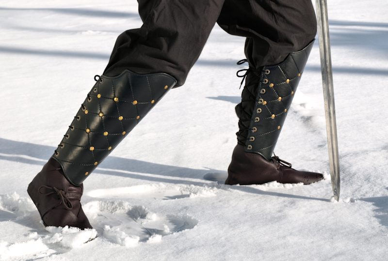Valmistettu laadukkaasta, tukevasta ja paksusta nahasta käsityönä. Paksu ja kova nahka suojaa hyvin iskuilta, mutta on mukava ja kevyt käyttää pitkiäkin aikoja. Suojaamattomat jalat olivat houkutteleva kohde menneisyyden taistelukentillä, sillä liikuntakyvytön soturi ei enää pärjännyt taistelussa. Säärisuojia ruvettiinkin käyttämään jo kauan ennen kirjoitettua historiaa suojaamaan taistelijoiden jalkoja viilloilta. Myymämme nahkaiset säärisuojat sopivat useiden eri aikakausien ja tyylien asuihin aina roomalaisesta sotilaasta keskiaikaiseen seikkailijaan ja fantasia-asuihin. Soveltuu suojaksi niin pehmomiekkailuun kuin kevyemmäksi suojaksi puu- ja teräsmiekkailuunkin. Kova nahka on ollut suosittu haarniskamateriaali kautta aikain, sillä se suojaa viilloilta erittäin hyvin ja antaa suojaa myös lyöntien murskavaikutukselta. Paketissa mukana kaksi säärisuojaa.