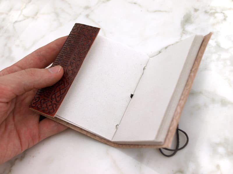 Tämä näppärä pieni muistikirja on tehty kokonaisuudessaan käsintehdystä paperista ja sidottu kohokuvioituihin nahkakansiin. Kirjaa voi käyttää mm. muistikirjana, kauppiaan kirjanpitoon, osoitekirjana, piirtäjän luonnosteluvihkona, taikojen muistiin kirjoittamiseksi jne. Kirjan saa sidottua tukevasti kiinni narulla. Nahkakannen paksuus noin 2 mm. Yhteensä noin 45 yksittäistä tyhjää sivua.