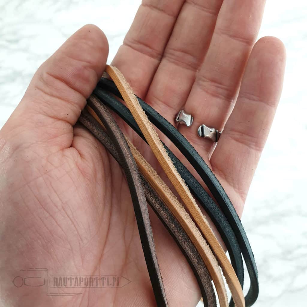 Iänikuisen vanhana materiaalina luonnollinen nahka sopii lukemattomiin projekteihin Naru on poikkileikkaukseltaan neliskanttinen ja sen paksuus/leveys on noin 2,35 – 2,5 mm Narut ovat n. 120 cm pitkiä Saatavilla mustana, ruskeana ja vaalean ruskeana