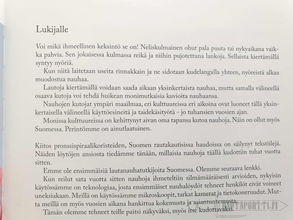 Suomessa on ainutlaatuinen, tuhatvuotinen lautanauhakulttuuri. Rautakauden kutojat loivat huikean taidokkaita nauhoja tekniikoilla, jotka kaikki esitellään tässä kirjassa. Rautakautiset nauhat on tutkittu ja kudottu uudelleen nykyajan ihmisen ihailtaviksi ja kudottaviksi. Kirjan kaikki nauhat perustuvat Suomesta löydettyihin arkeologisiin lautanauhoihin. Tuhat vuotta sitten maahan haudatut aarteet ovat täten jälleen nähtävissä ja käsin kosketeltavissa.