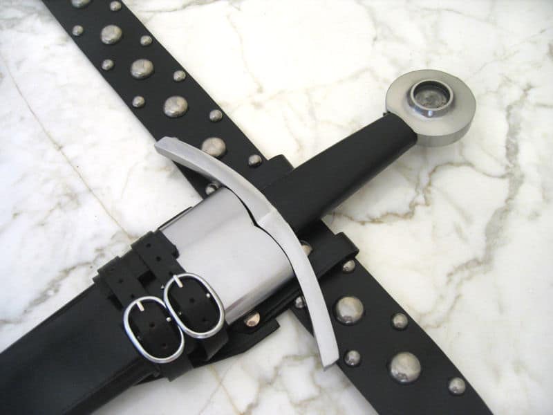 Nahkainen, niiteillä koristeltu ja vahvistettu, vyö sopii useimpien eri aikakausien puvustuksiin aina Assyriasta vallankumouksen aikaiseen Amerikkaan. Valmistettu paksusta ja laadukkaasta nahasta käsityönä. Tällaisen tukevan, 5 cm leveän, vyön avulla saat esim. tukevoitettua olkavyön paikalleen tai kannettua lonkalla niin miekat kuin tikaritkin. Vaihtoehtoina ruskea nahkavyö messinkisillä niiteillä ja soljella tai musta nahkavyö uushopeaisilla niiteillä ja –soljella.